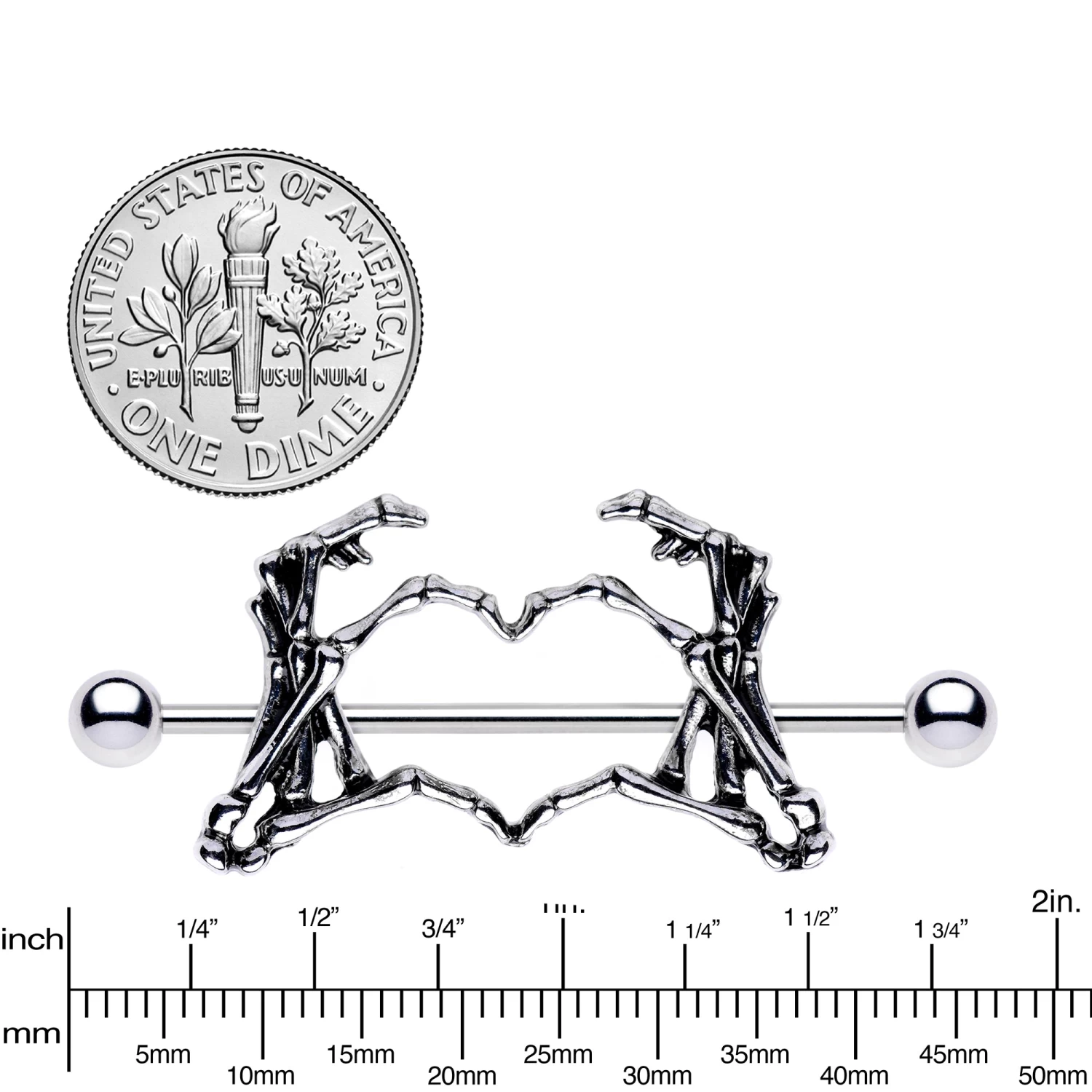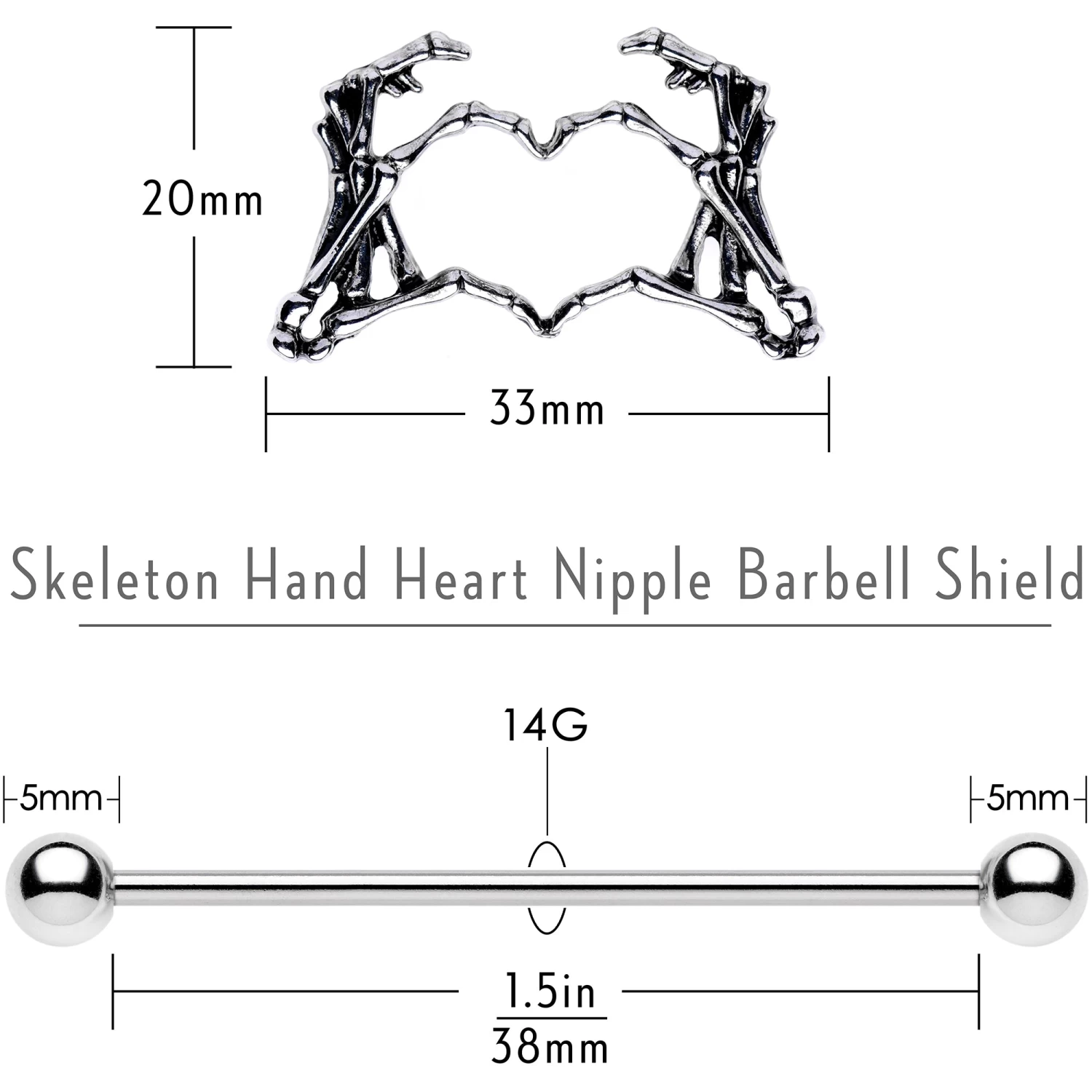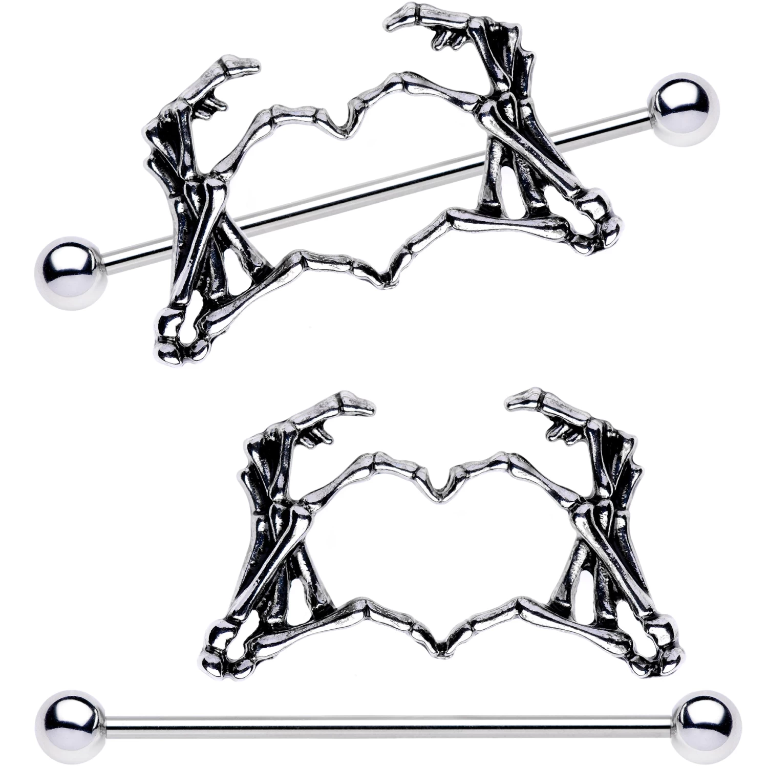 Tap into your creepy side with these lovely, weird, and fun barbell nipple rings. These 14 gauge barbell nipple shields feature large, skeleton hand charms that form a heart between their fingers! The skeleton hand charms are set on a pair of 38mm in length straight barbells made with durable 316L surgical grade stainless steel and are perfect for Halloween, Valentine’s Day, or any time of year. Sold as a set of two!