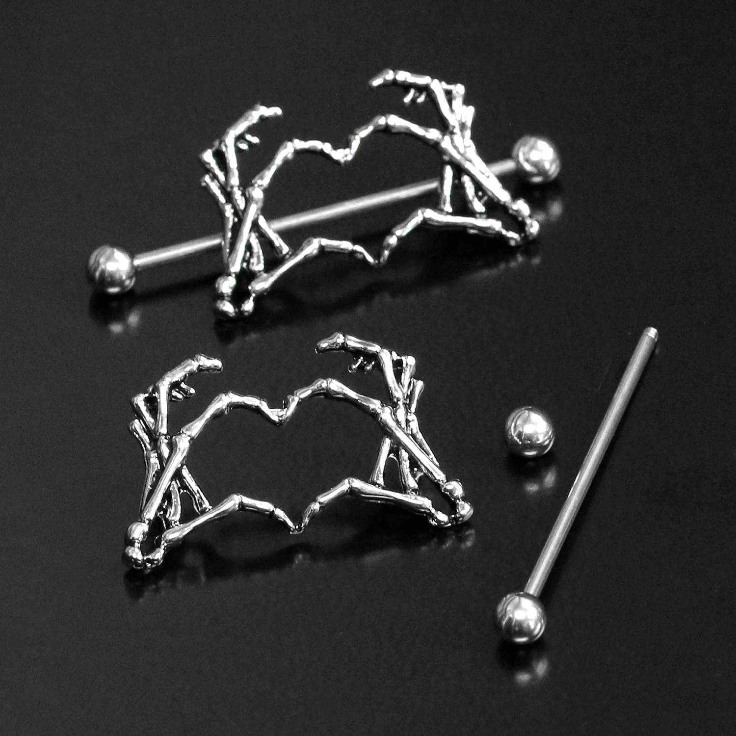1 1/2″ Skeleton Hand Heart Nipple Barbell Shield Set