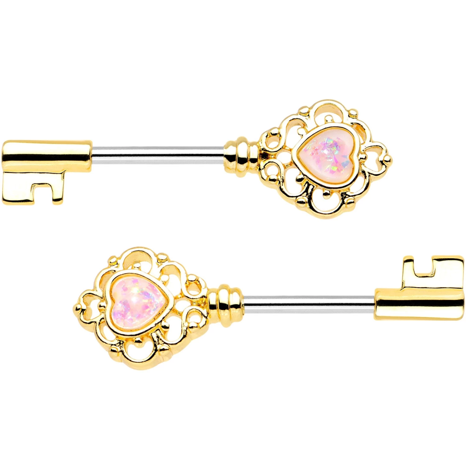 1/2″ White Faux Opal Gold Tone Heart Key Barbell Nipple Ring Set
