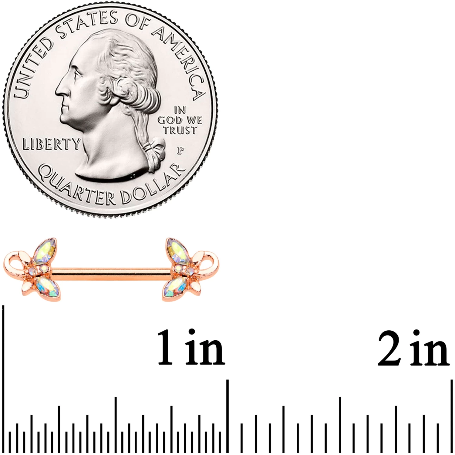 14 Gauge 1/2 Aurora Gem Rose Gold Tone Loop Butterfly Nipple Ring Set