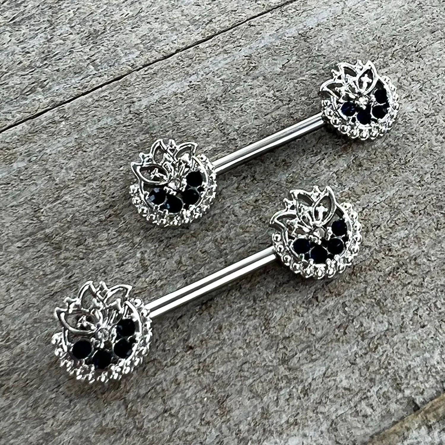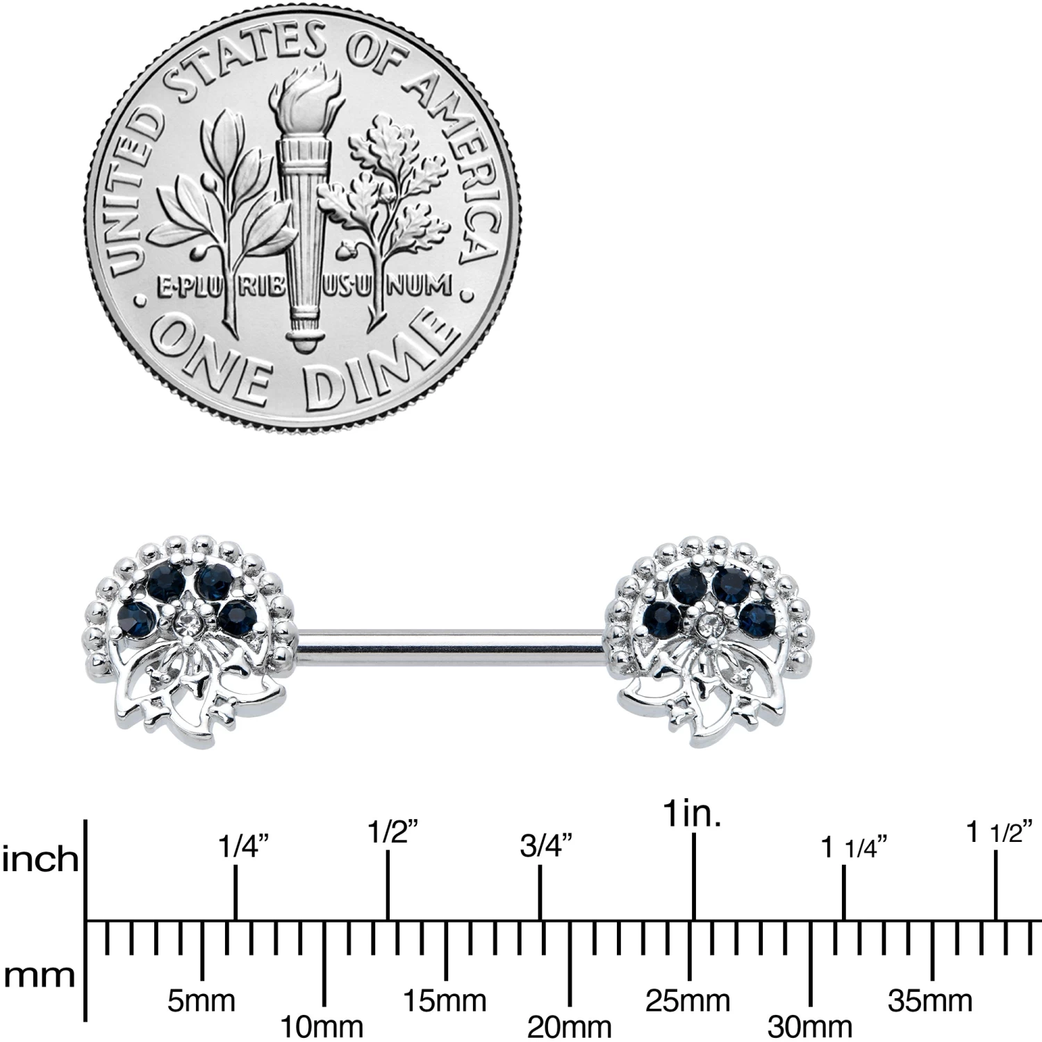 The curves on this 14 gauge nipple jewelry are sure to catch eyes! It’s made with 12mm durable 316L surgical grade stainless steel straight barbells. Each of the ends features an abstract arch charm, with the outermost rims set with textured embellishment and the inner curves set with deep blue gems. Below those are abstract flower designs with clear gem centers. Get abstract with these elegant nipple piercing rings! Sold as a set of two.