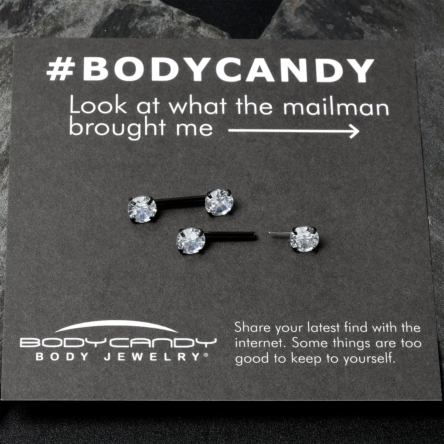 Add some sexy sophistication to your nipple piercings with this 14 gauge nipple jewelry! It’s made with 12mm black PVD over 316L surgical grade stainless steel straight barbells. The charm ends are threadless round clear cubic zirconia gems made to make insertion and removal a breeze while still offering a secure fit. With their easy elegance and uncomplicated sophistication, these nipple piercing rings really do have it all! Sold as a set of two.