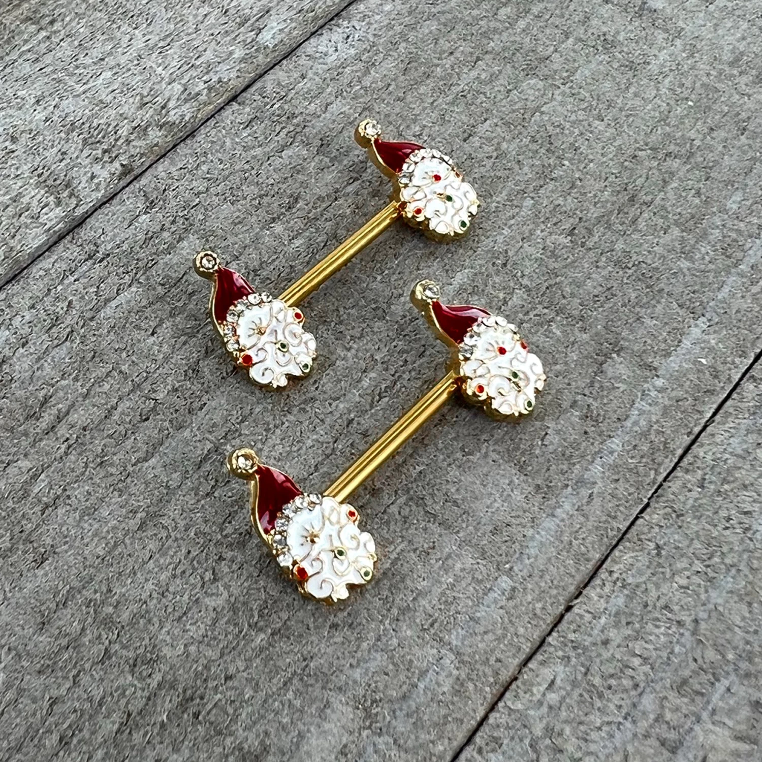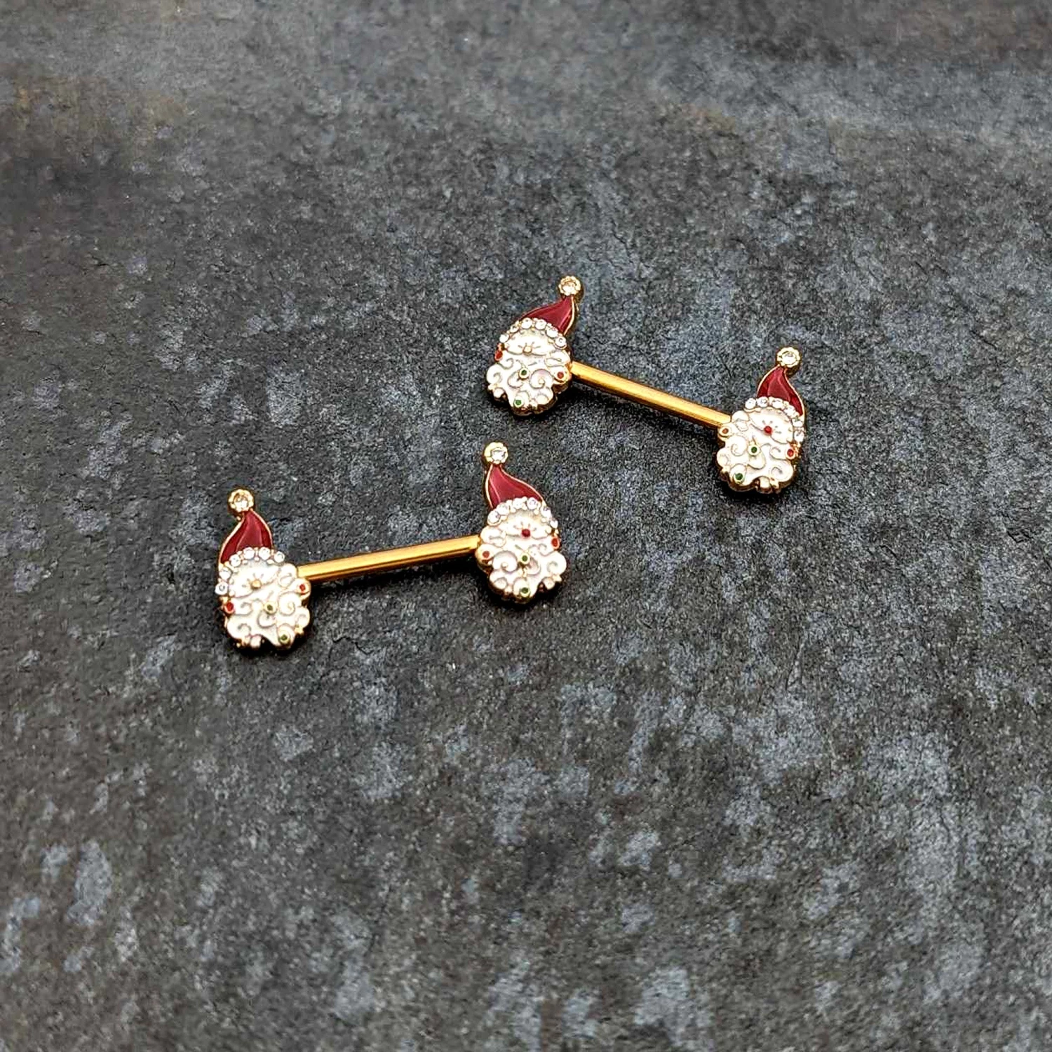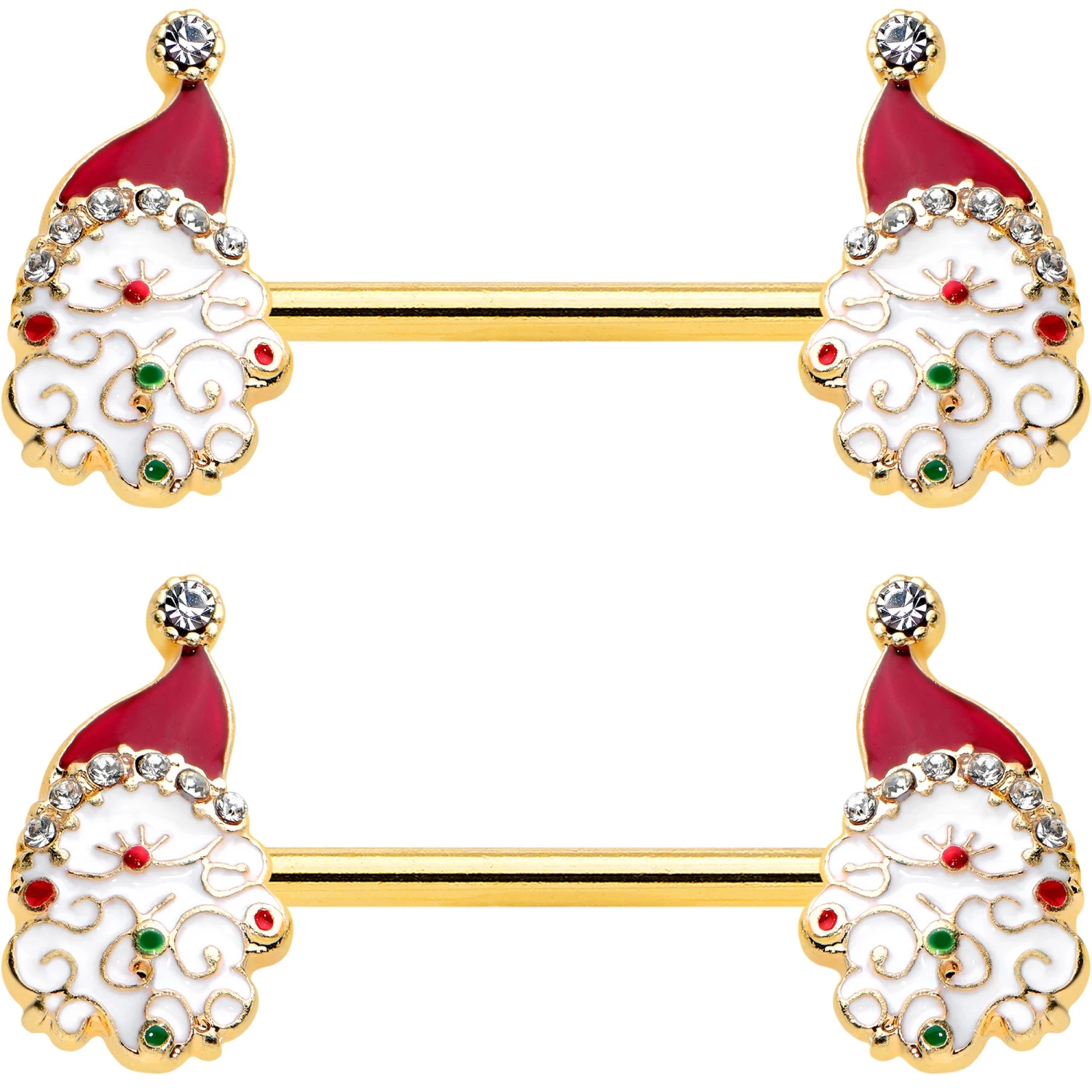 14 Gauge 1/2 Clear Gem Gold Tone Decorated Santa Barbell Nipple Ring Set