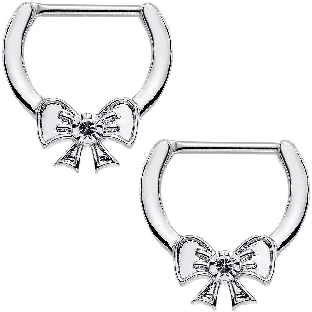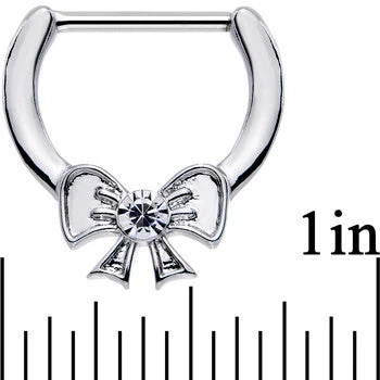 If you’ve been yearning for some new style to decorate your nipple piercings, then we’ve got the answer with this 14 gauge nipple clicker set. This nipple jewelry makes insertion and removal easy as can be with its 12mm long straight hinged barbells made from durable 316L surgical grade stainless steel. The bold feminine design of this nipple ring set features a ribbon tied in a bow with a clear gem highlighting its center and they are sold as a set of two for you.
