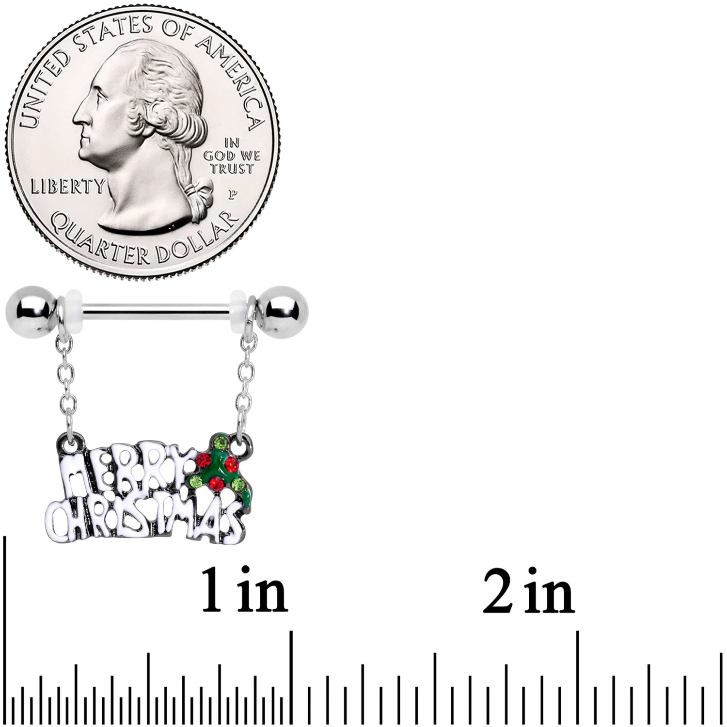 Keep the message simple and sexy with this 14 gauge nipple jewelry! It’s made with 17mm durable 316L surgical grade stainless straight barbells with 5mm ball ends. Each one features a length of matching silver-tone chain, supporting a charm that says Merry Christmas in white letters. The charm is embellished with a green Christmas tree, set with tiny red gems. Get right to the point with this festive dangle nipple piercing jewelry! Sold as a set of two.