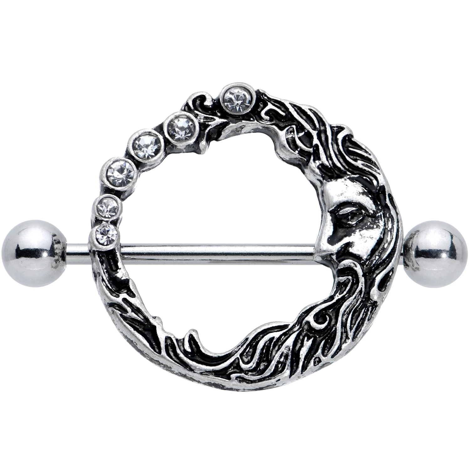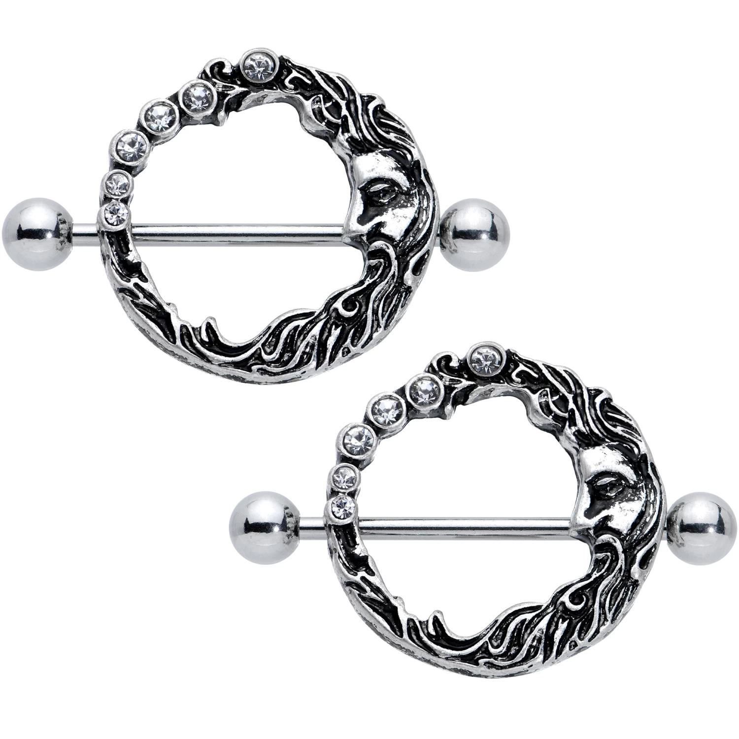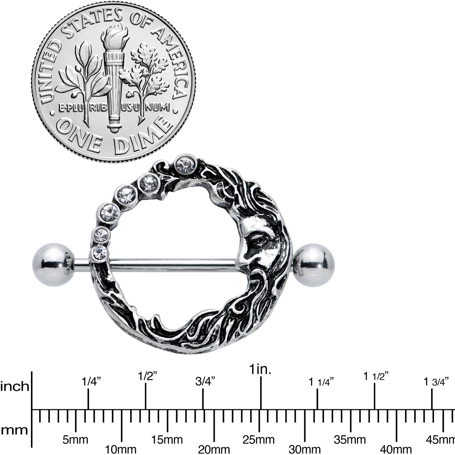The man in the moon has a whole new look on this 14 gauge nipple jewelry! It’s made with 18mm wearable length 316L surgical grade stainless steel straight barbells with 5mm ball ends. The shield portion features a moon design, with a kindly looking face in it. They’re embellished with clear gems for an added touch of style and they’re heavily burnished to really make the details pop. Add some moon magic to your nipple piercings with these luscious, lunar nipple shields! Sold as a set of two.