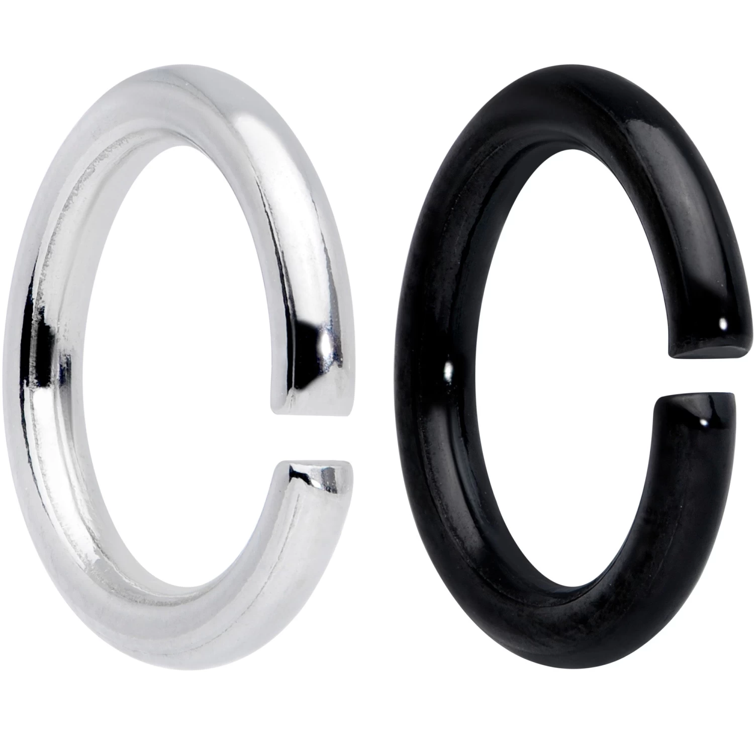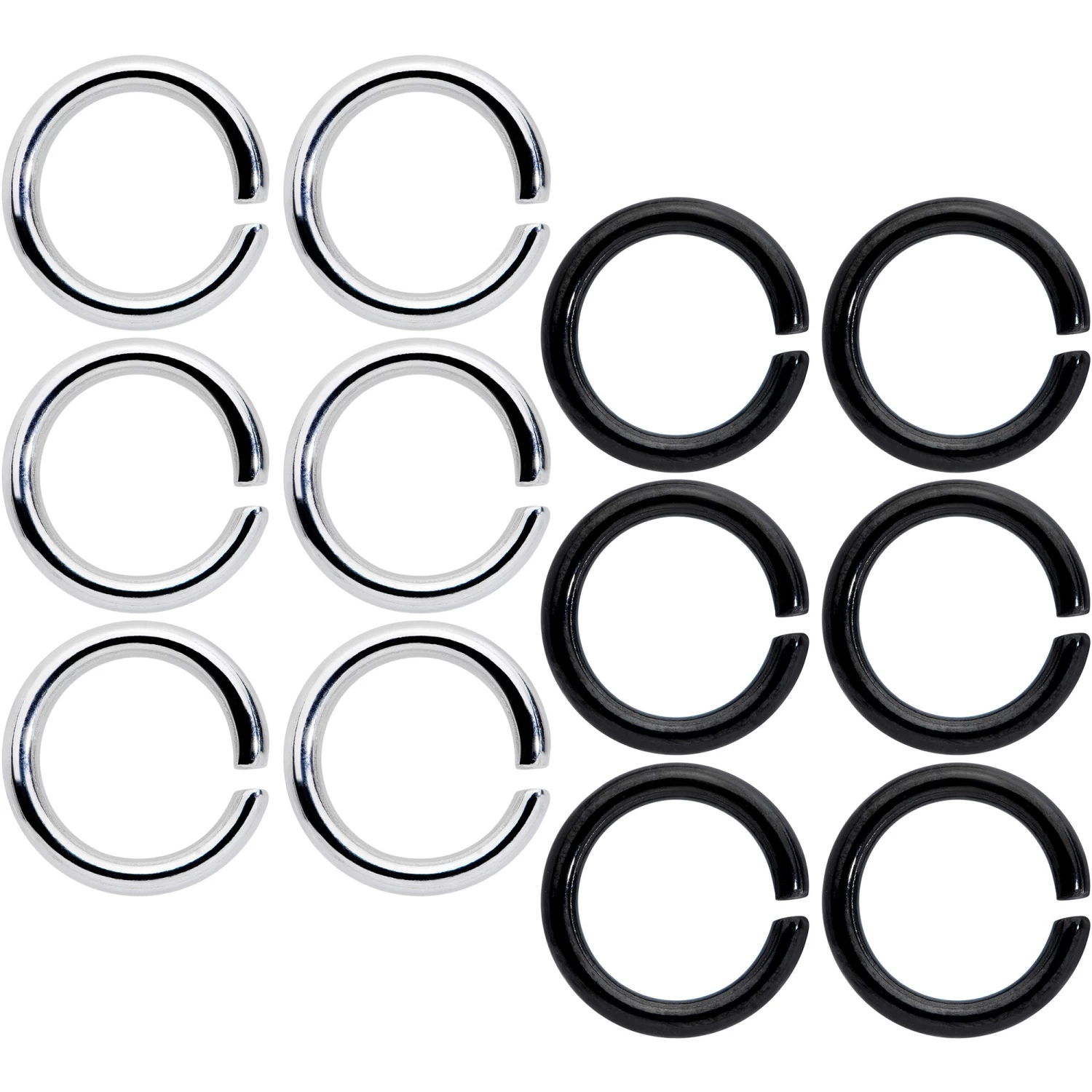 Whether you have multiple cartilage piercings and prefer a matching look or are simply prone to losing things, this set of 14 gauge cartilage rings has you covered. Six are made with 8mm durable 316L surgical grade stainless steel circular rings and the other six are made with 8mm black anodized over 316L surgical grade stainless steel circular rings for a colorful and comfortable feel. This cartilage jewelry is super easy to insert and remove – simply twist the ring open, insert, and then twist gently shut again. And you can rock these rings in multiple piercings including septum, navel, some eyebrow piercings, and stretched lobes! Sold as a set of twelve.