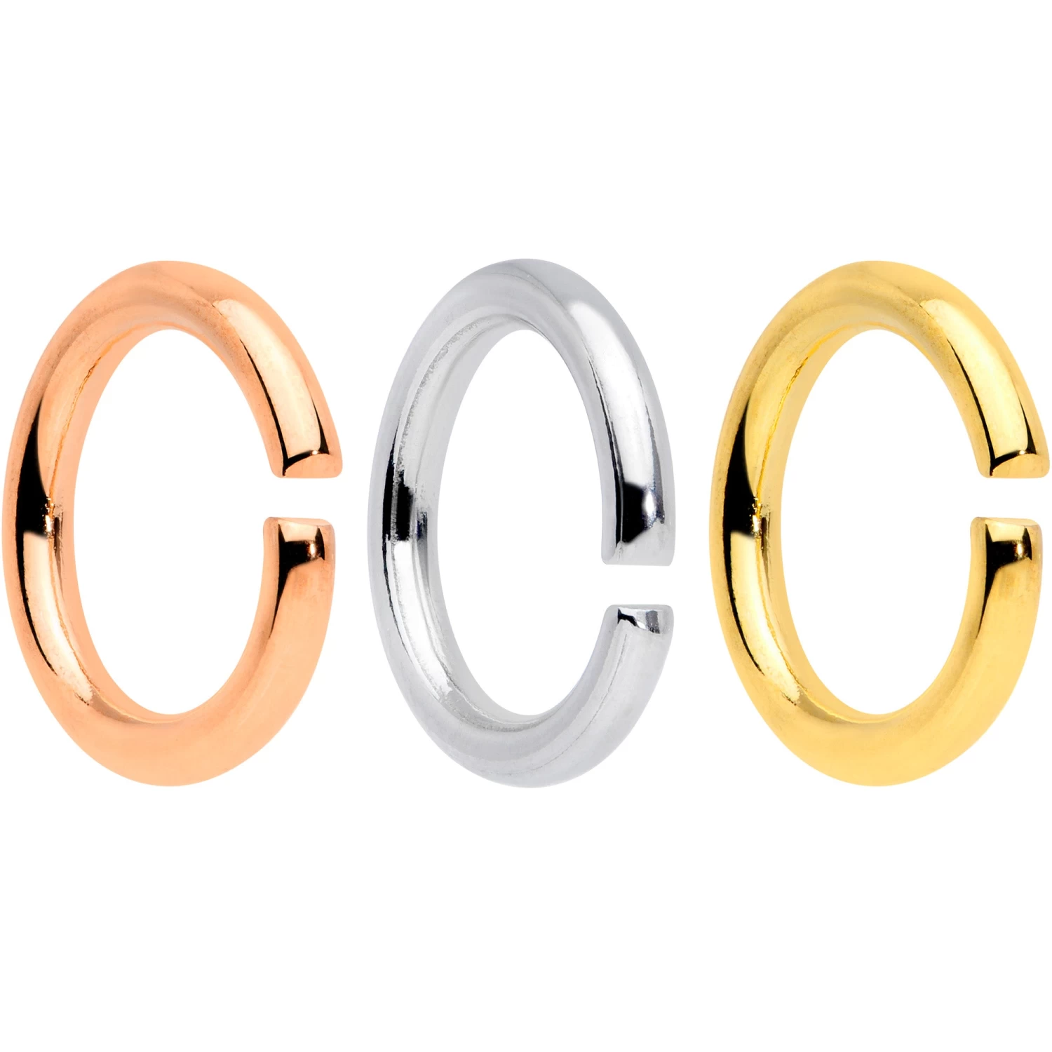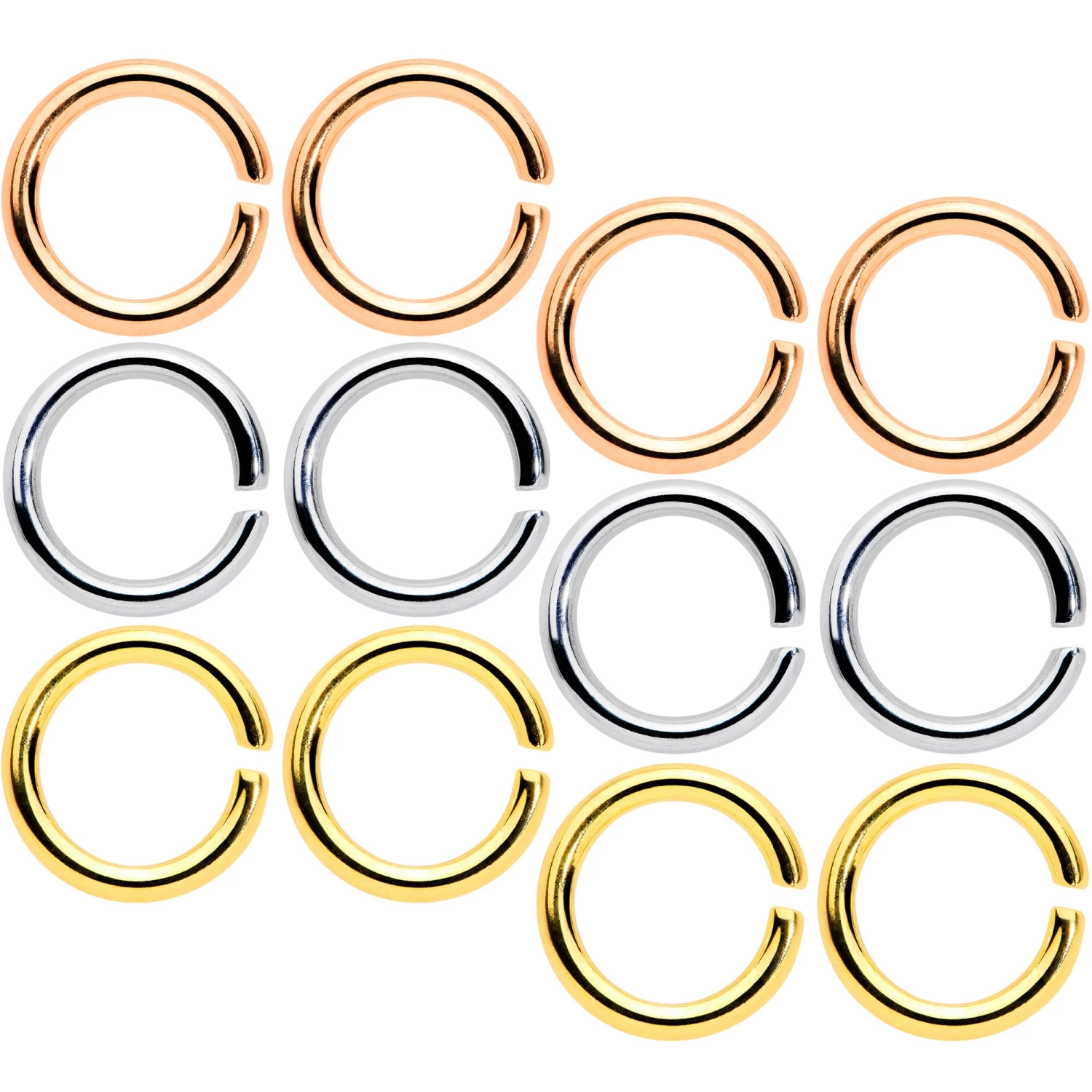 Whether you have multiple cartilage piercings and prefer a matching look or are simply prone to losing things, this set of 14 gauge cartilage rings has you covered. Four are made with 8mm durable 316L surgical grade stainless steel circular rings and four are made with 8mm gold tone anodized over 316L surgical grade stainless steel circular rings for a colorful and comfortable feel. The remaining four are made with 8mm rose gold tone anodized over 316L surgical grade stainless steel seamless circular rings. This cartilage jewelry is super easy to insert and remove – simply twist the ring open, insert, and then twist gently shut again. And you can rock these rings in multiple piercings including septum, navel, some eyebrow piercings, and stretched lobes! Sold as a set of twelve.