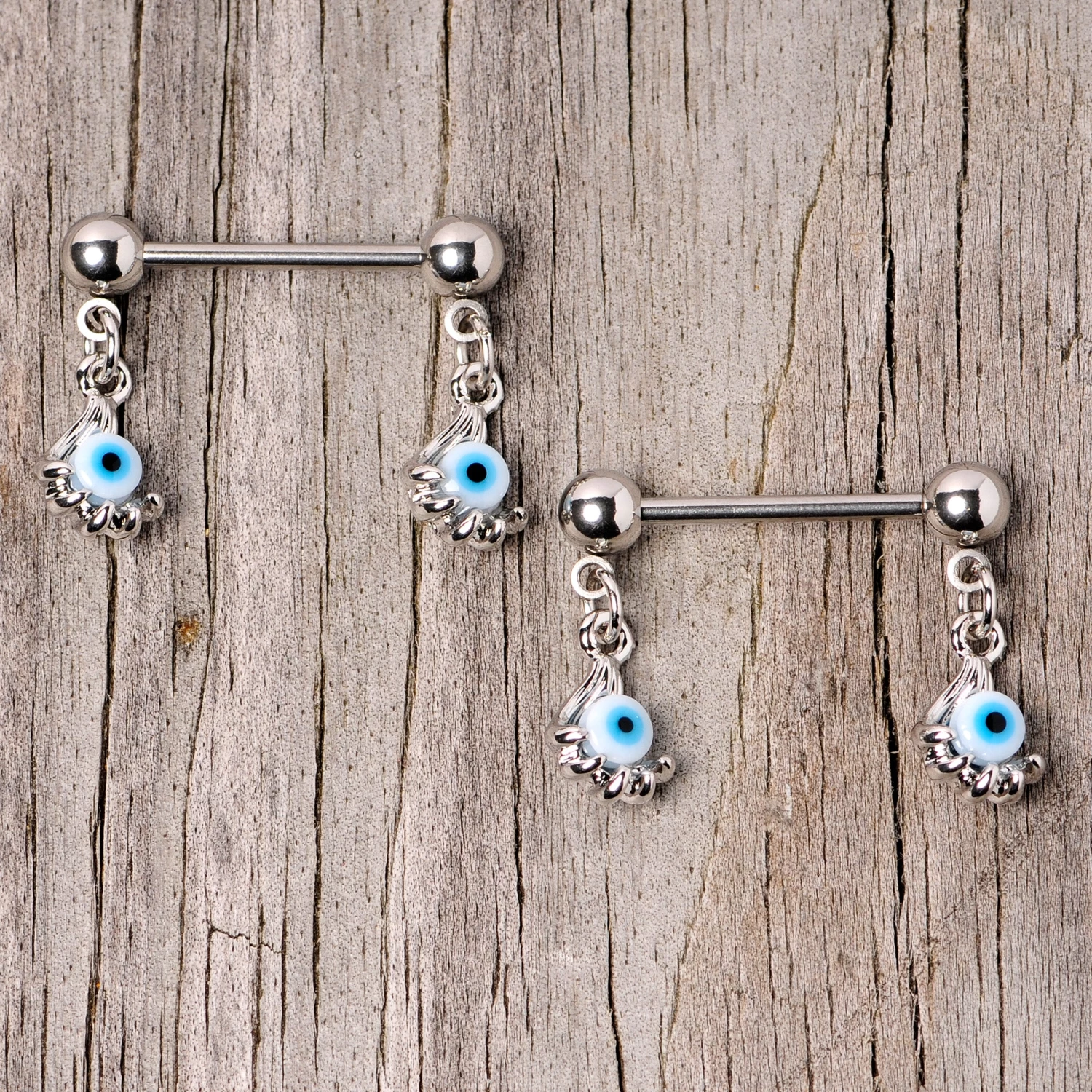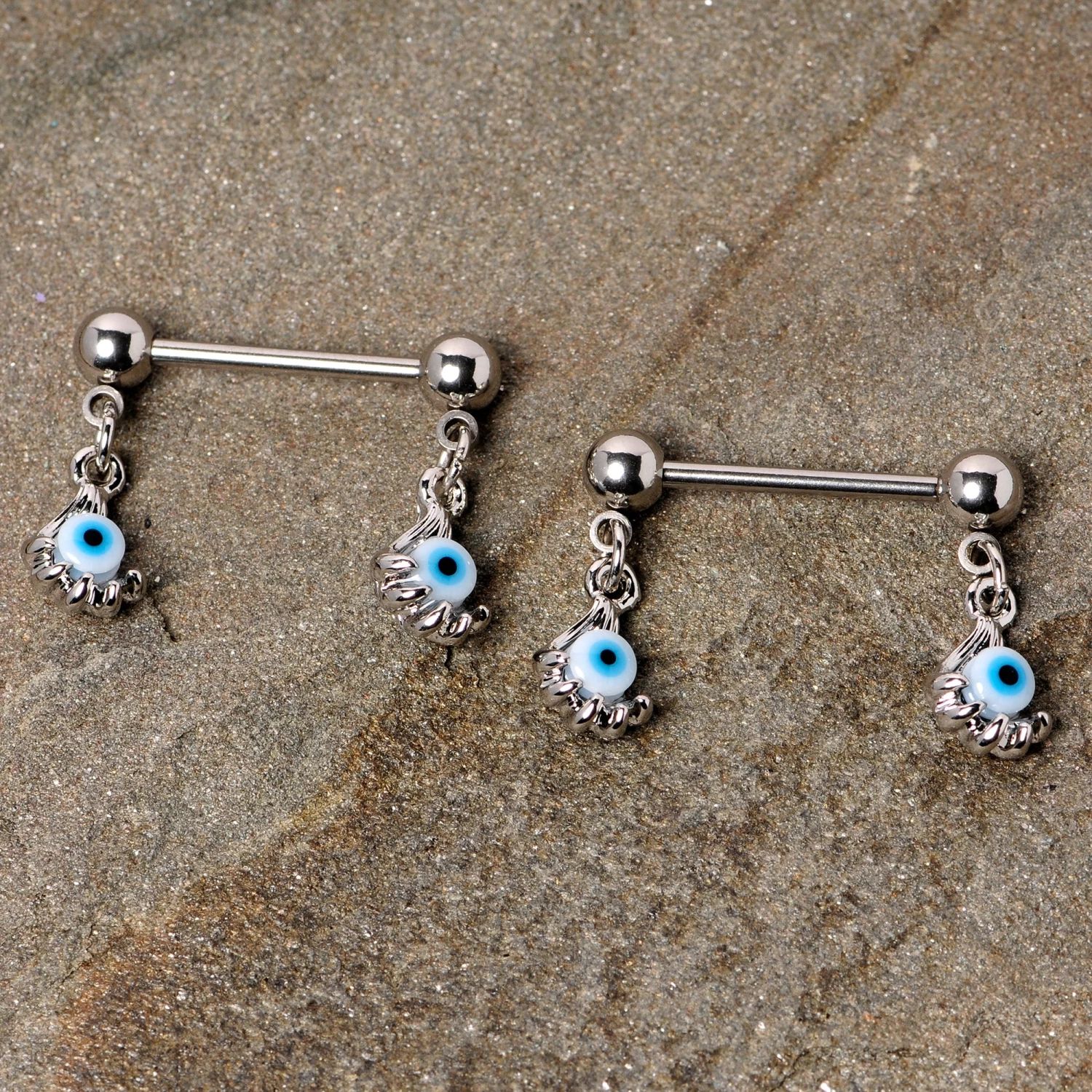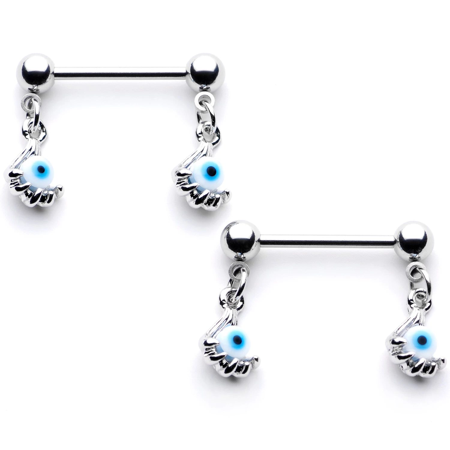 14 Gauge 5/8 Blue Eyeball Hand Halloween Dangle Nipple Ring Set