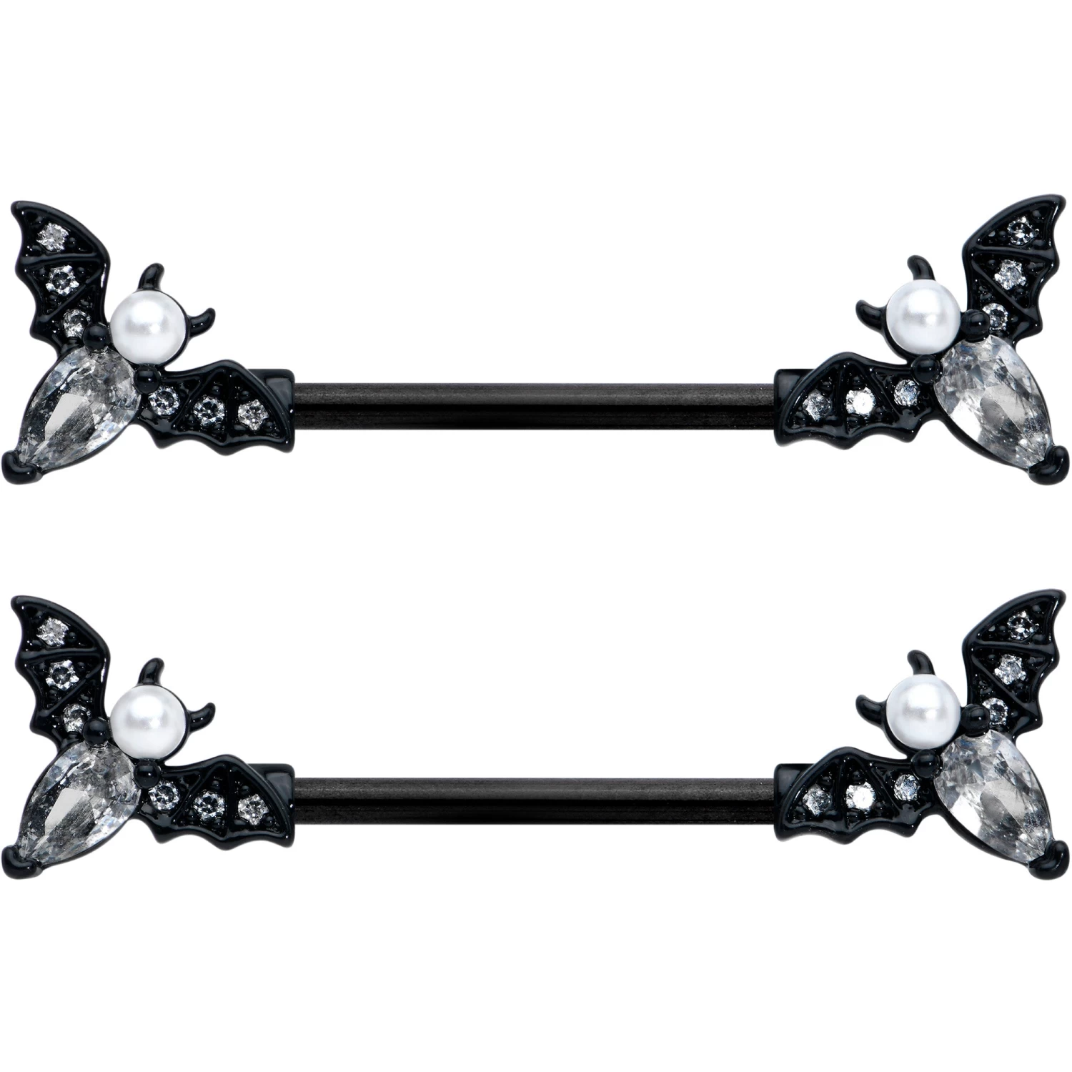 Let your piercings soar through the night skies like the bat on this 14 gauge nipple jewelry! It’s made with 16mm black PVD over 316L surgical grade stainless steel straight barbells. The ends feature bat charms with their wings set with small clear gems. The bat’s body is a single oval clear gem while its head is a white pearlescent orb. They’re perfect for Halloween or to accessorize any gothic aesthetic. You’re bound to be besotted with these Halloween bats! Sold as a set of two.