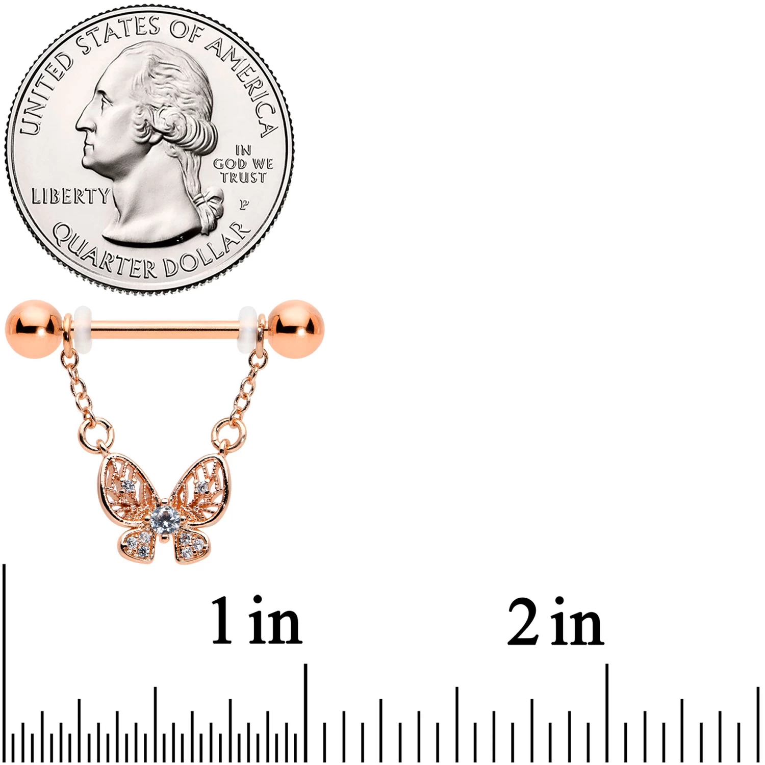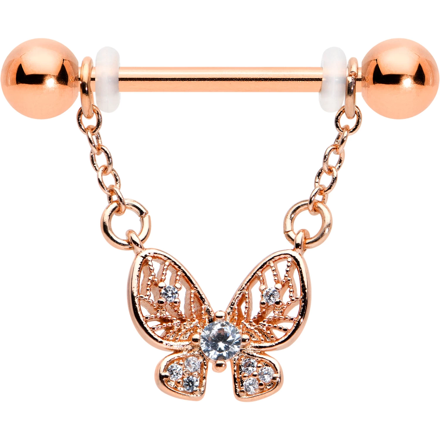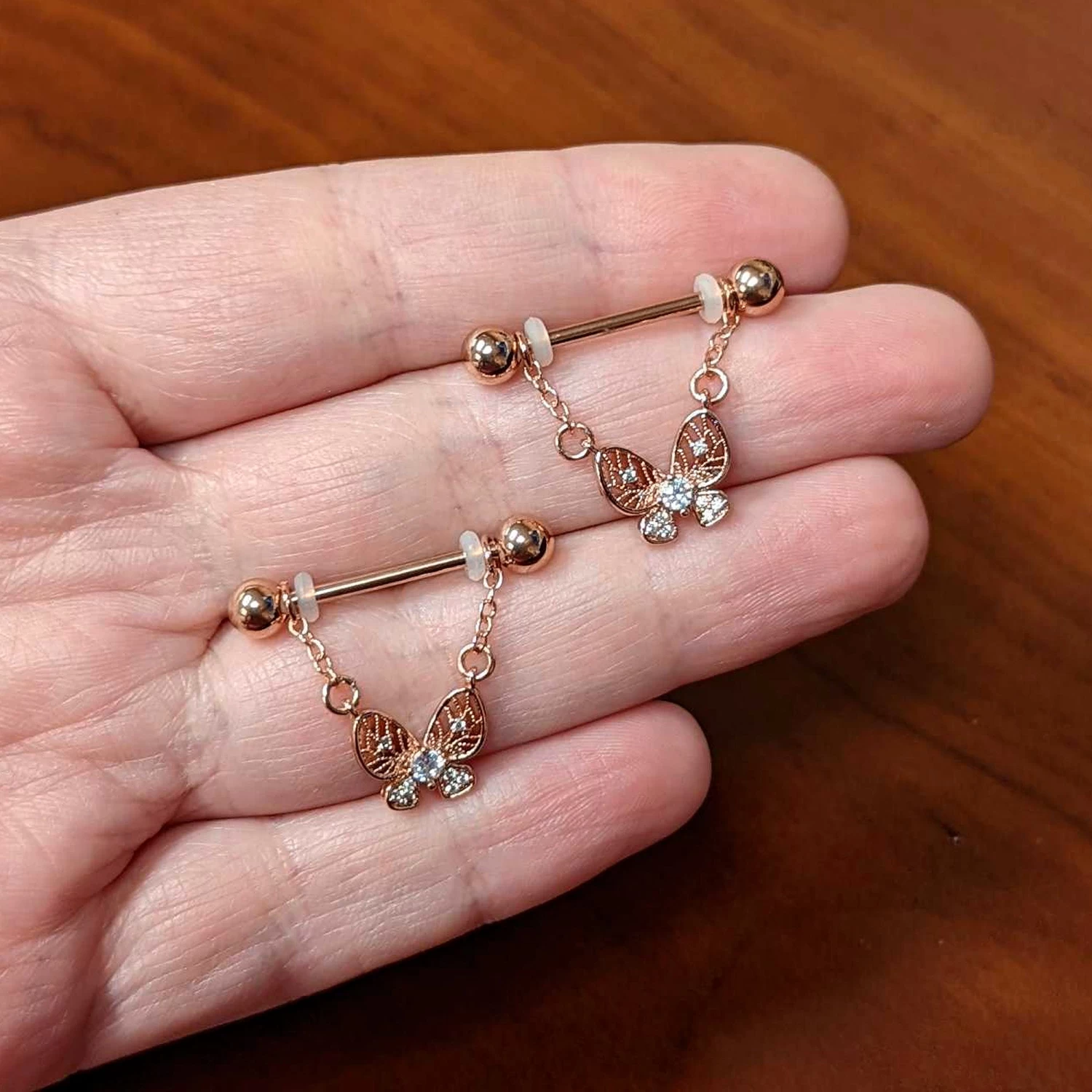 The butterflies on this 14 gauge nipple jewelry will have you feeling like you’re walking on air! It’s made with 16mm rose gold tone PVD over 316L surgical grade stainless steel straight barbells with 5mm ball ends. They each features a length of dangling chain which supports a butterfly charm, with openwork wings for an airy feel. The butterflies are further embellished with clear gems for an elegant appearance. These elegant butterfly nipple piercing rings will make you want to fly! Sold as a set of two.