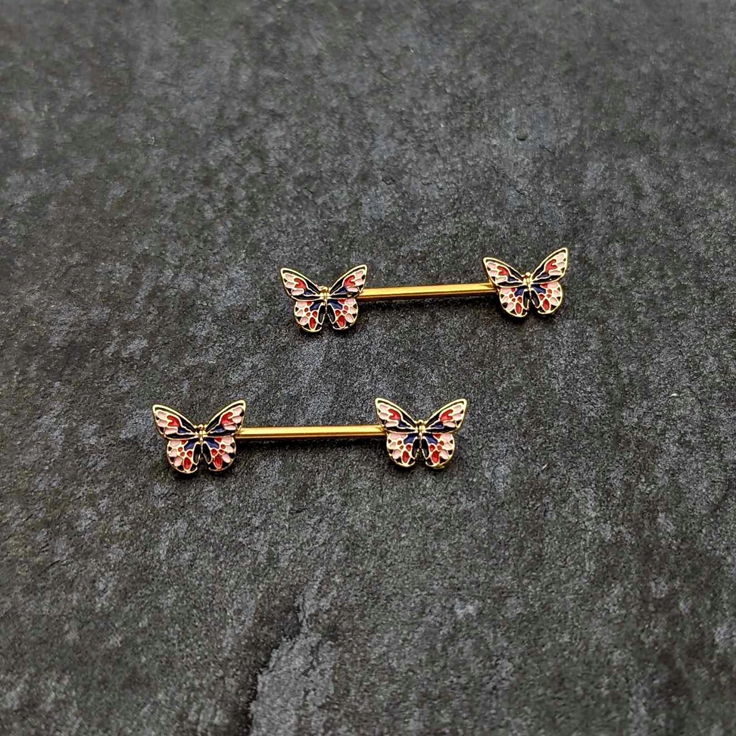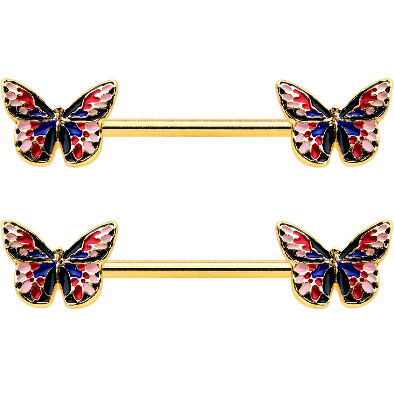 Spread your wings in striking color with this 14 gauge nipple jewelry! It’s made with 16mm gold tone PVD over 316L surgical grade stainless steel straight barbells. Each of the ends features a butterfly charm, the wings inlaid in red and blue on pink backgrounds. You’ll be ready to morph into something new and lovely with these butterfly nipple piercing rings. Sold as a set of two.