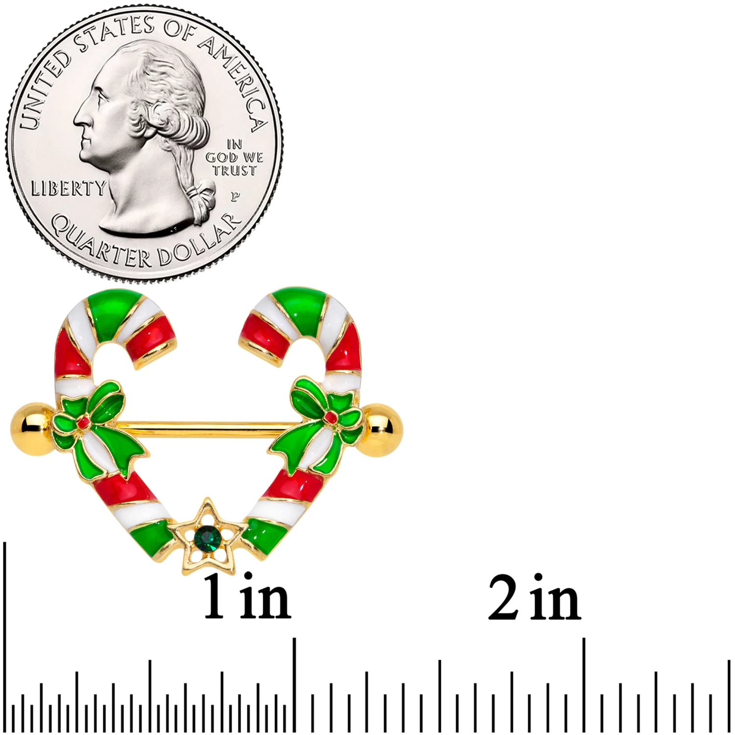 14 Gauge 5/8 Green Gem Gold Tone Candy Cane Christmas Nipple Ring Set