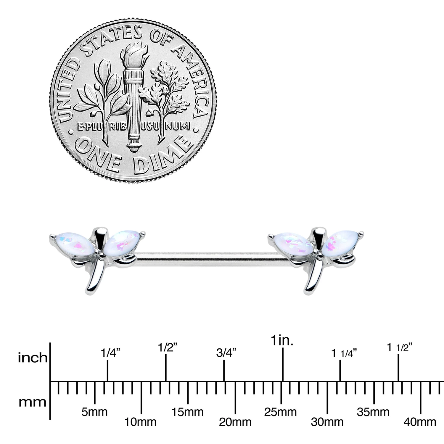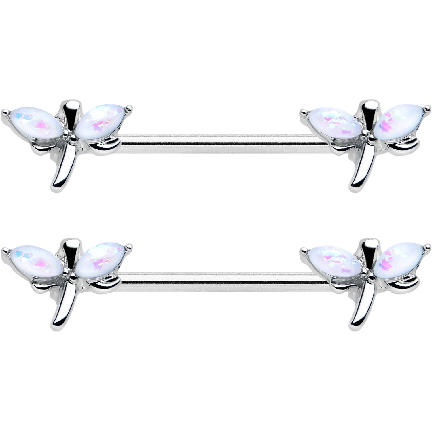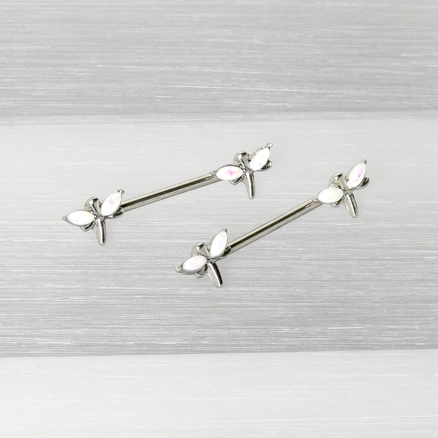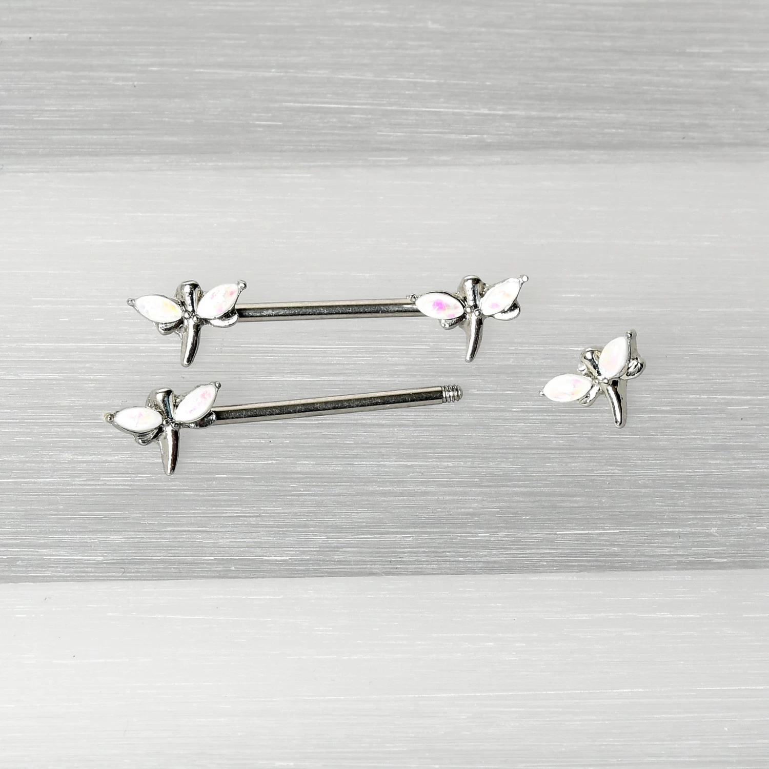14 Gauge 5/8 White Faux Opal Styled Dragonfly Barbell Nipple Ring Set