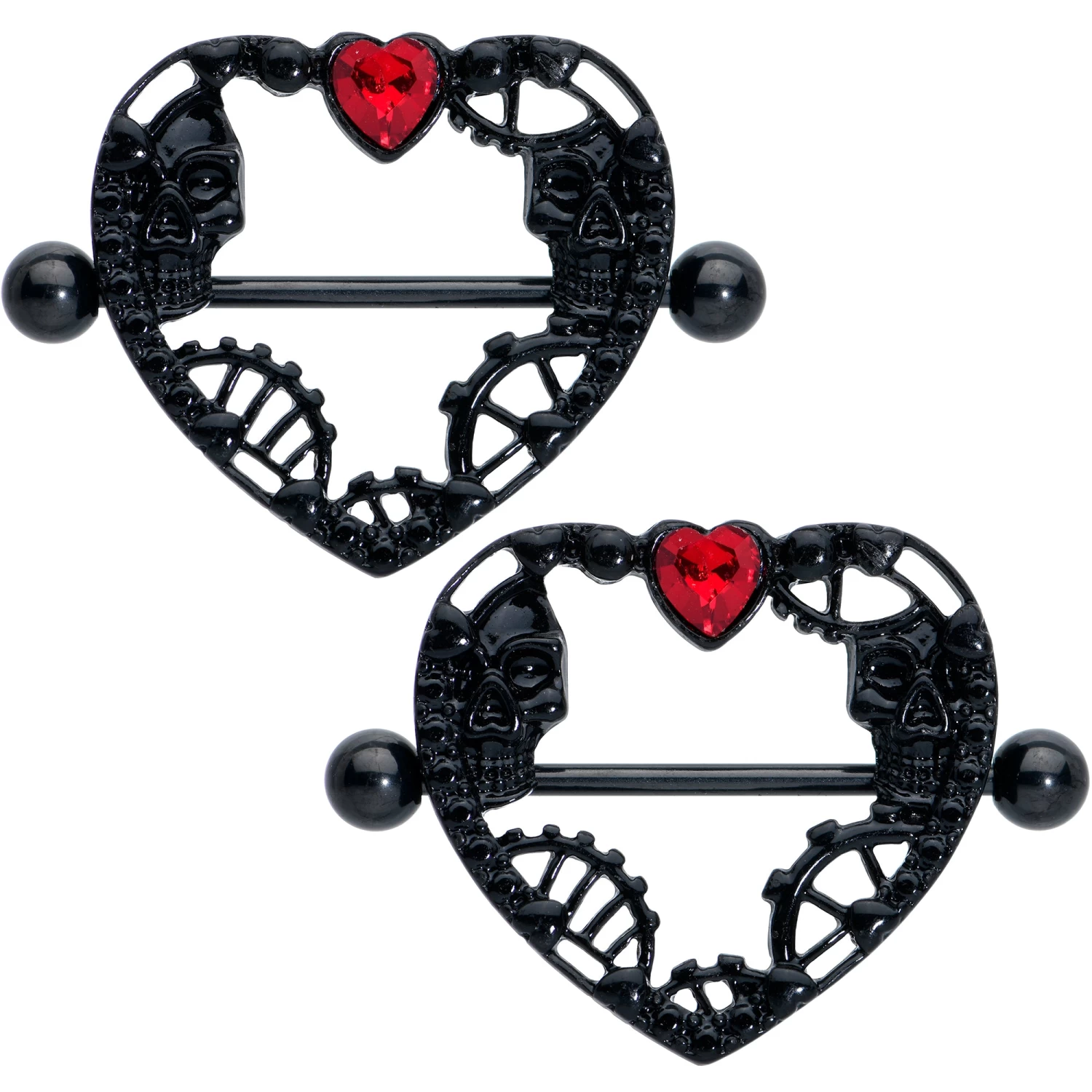 14 Gauge 7/8 Red Gem Black Skeleton Steampunk Heart Nipple Shield Set