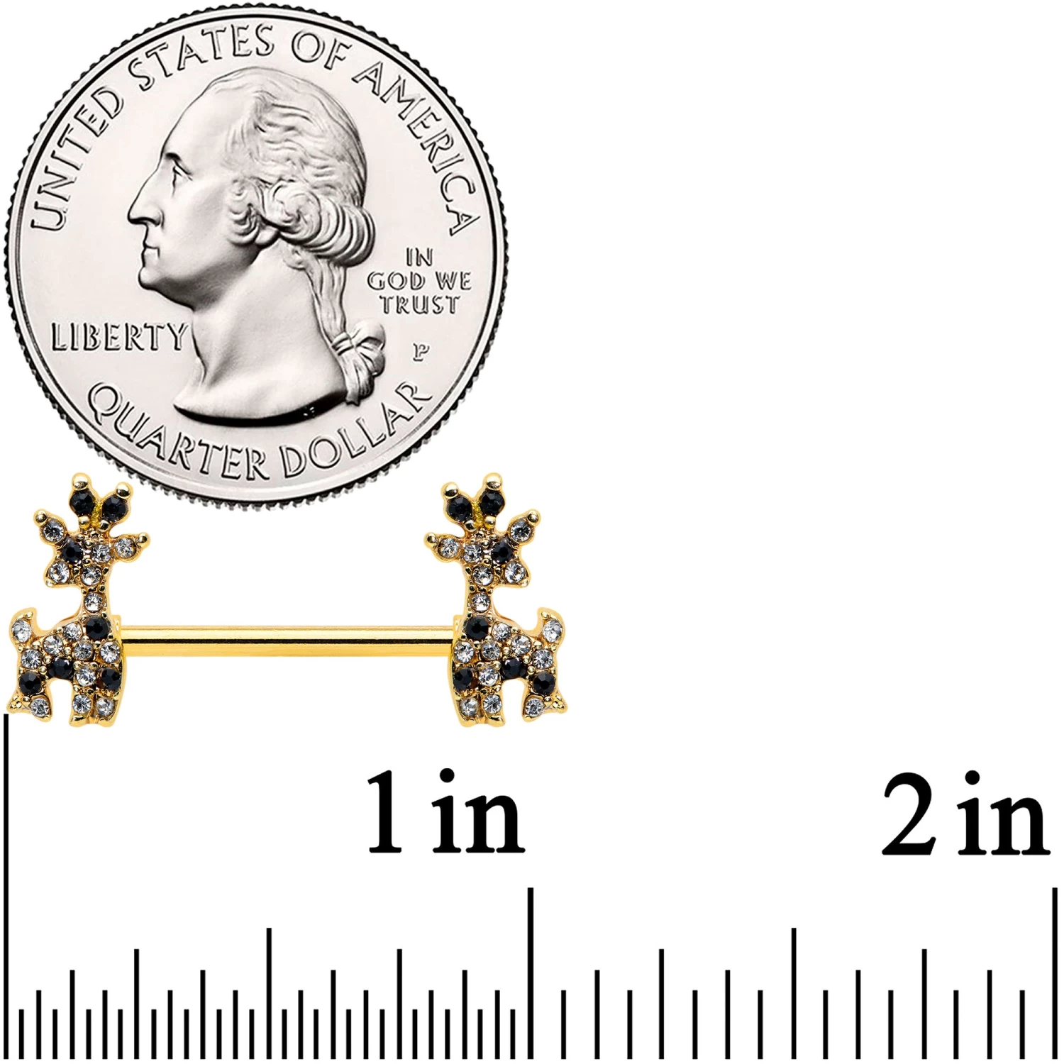 The deer on this 14 gauge nipple jewelry are all decked out and looking divine! It’s made with 14mm gold tone PVD over 316L surgical grade stainless steel straight barbells. Each of the ends features a deer charm, embellished with black and clear gems for some serious style. Whether you’re a deer devotee or a happy hunter, these does are sure to have you singing! Sold as a set of two.