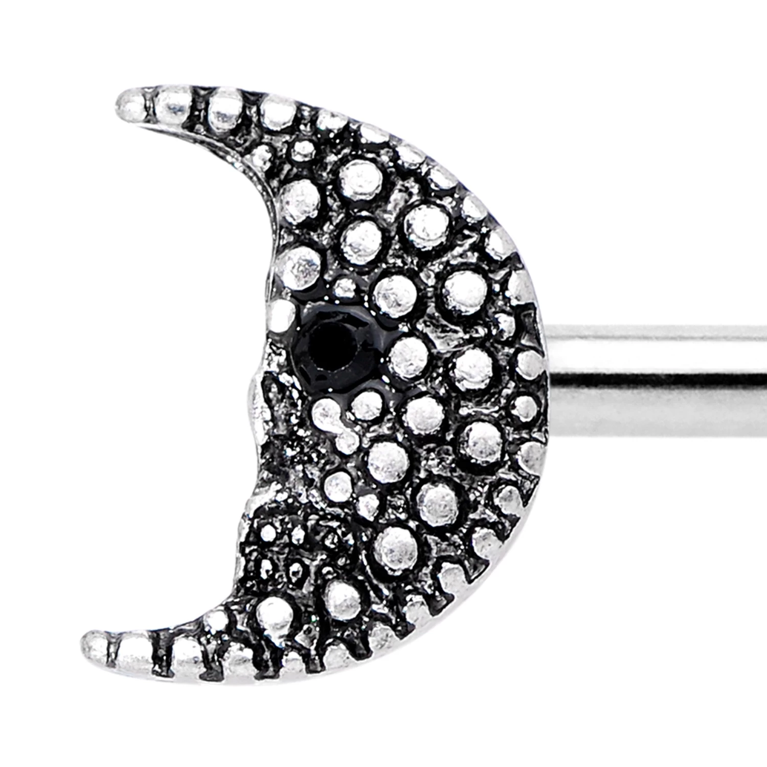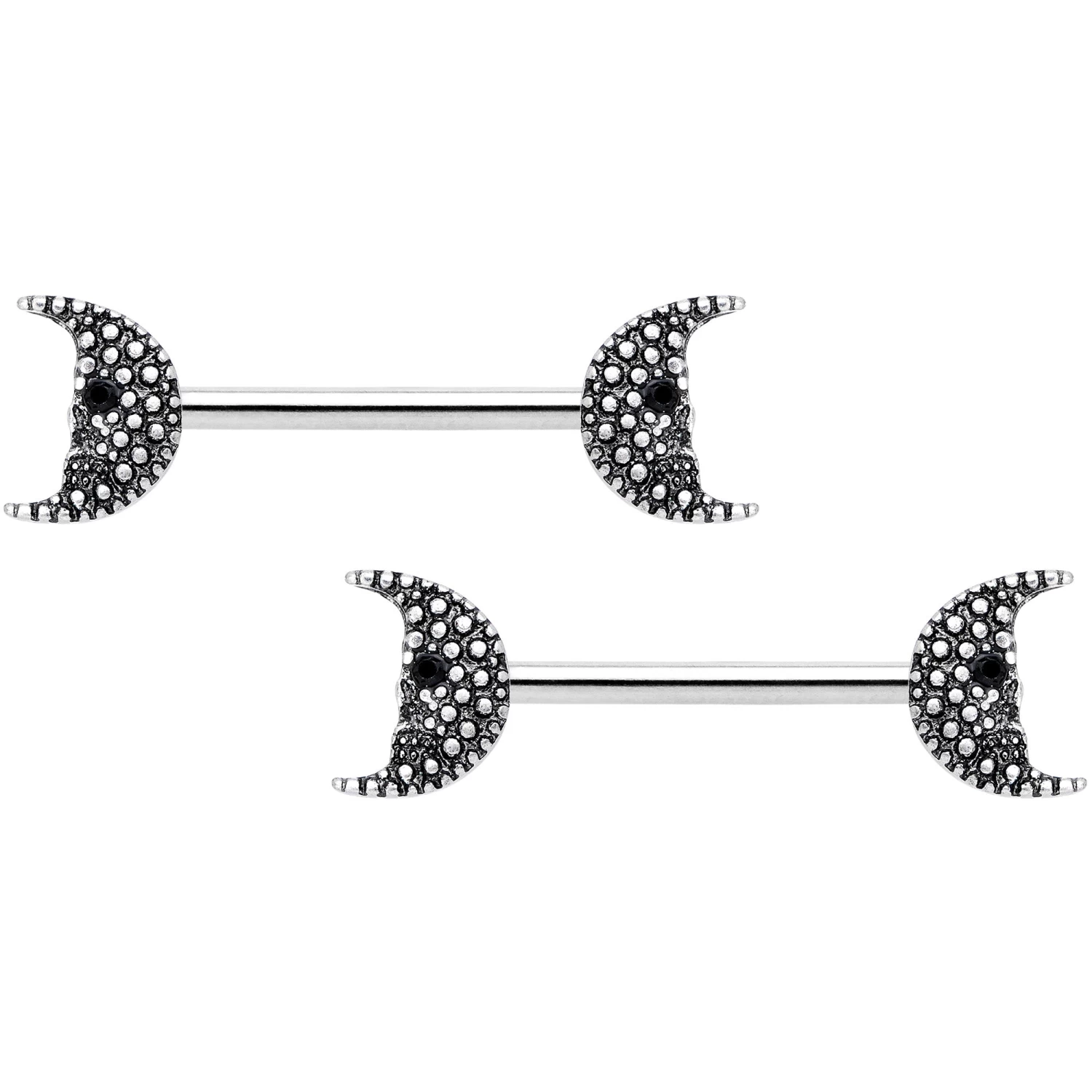 The man in the moon is looking a little grim these days, going from a giant rock to a rock and roll giant! This 14 gauge nipple jewelry is made with 14mm durable 316L surgical grade stainless steel straight barbells. Each end features a crescent moon with a pebbly texture, toothy grimace, and small black gems for eyes. Now you can hang out with the biggest “rock star” in all the night sky! Sold as a set of two.