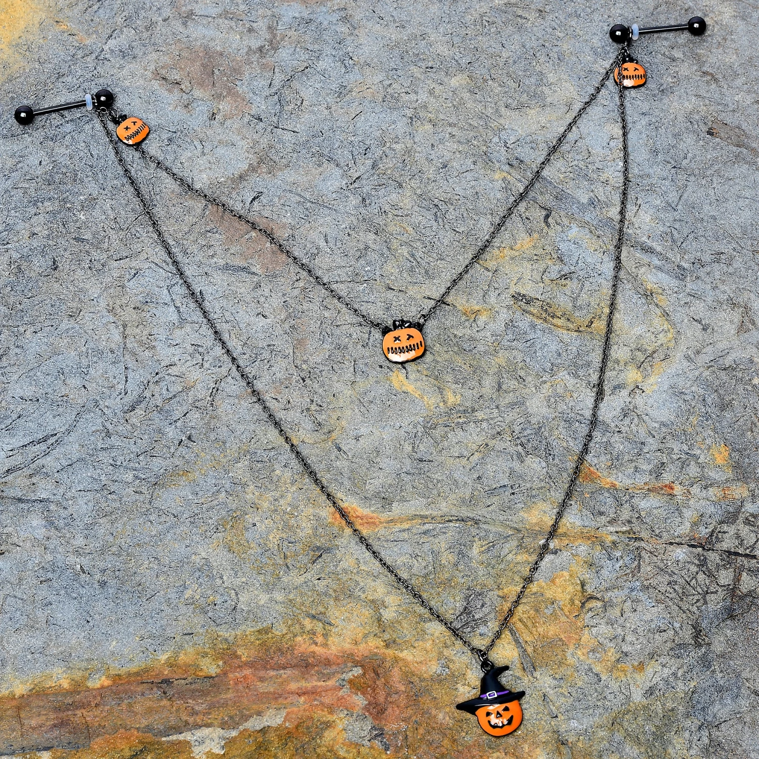 Don’t forget to decorate your nipple piercings for Halloween with this 14 gauge nipple jewelry! This set of nipple piercings are made with 14mm black PVD over 316L surgical grade stainless steel straight barbells with 5mm ball ends and are connected by a 8 3/8″ length of chain that has jack o’ lantern pumpkin charms dangling from from both the barbells and the central point of the chain! It’s further embellished with a longer length of chain that features a pumpkin charm wearing a witch’s hat for a the perfect Halloween combination! Each pumpkin charm is orange and is detailed with a spooky face that’s perfect for Halloween! Let these pumpkins add a pinch of the petrifying to your piercings this Halloween season!