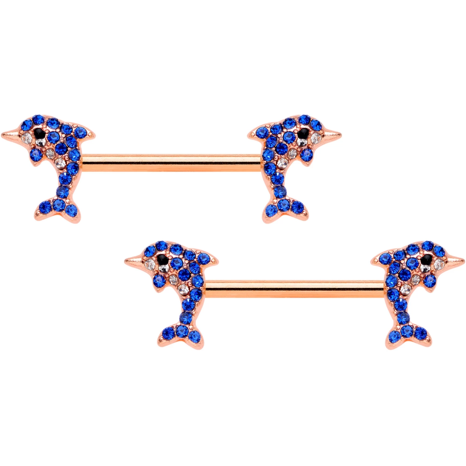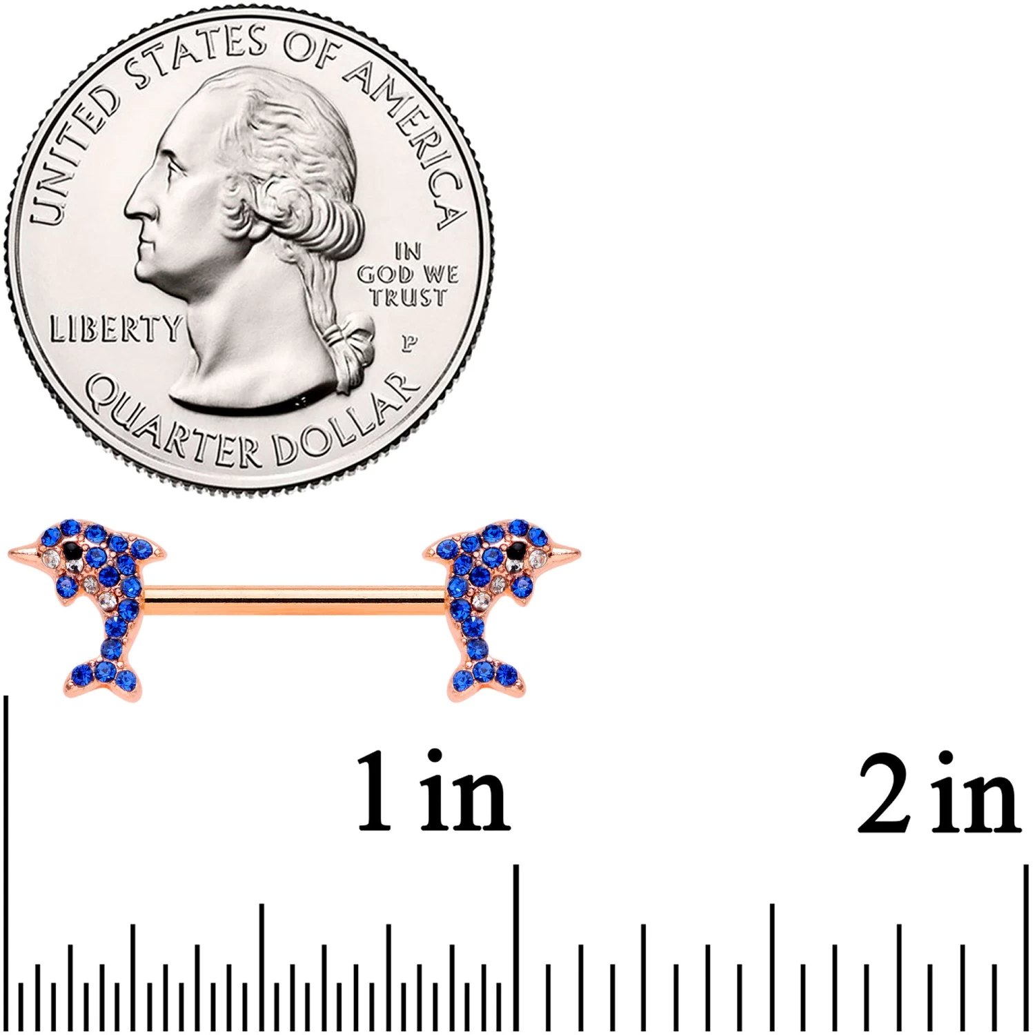 14 Gauge 9/16 Blue Gem Rose Gold Tone Dolphin Barbell Nipple Ring Set