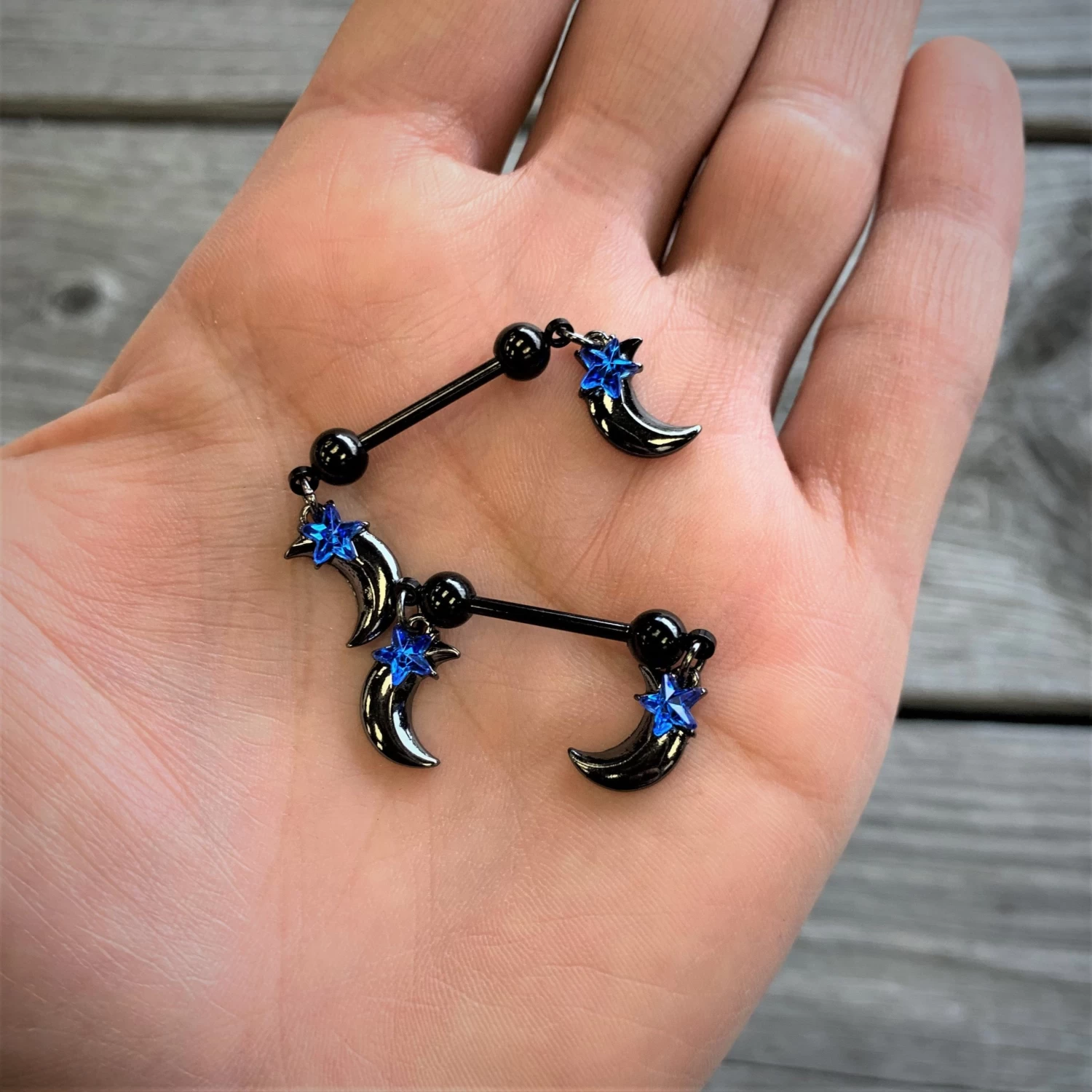 If you’re looking for nipple jewelry that is perfect for the Halloween season this pair of crescent moon 14 gauge nipple rings are a great choice. Made with 14mm black PVD over 316L surgical grade stainless steel straight barbells, these barbell nipple rings feature black ball ends with moon dangle charms and blue gem star charms. Sold as a set of two.