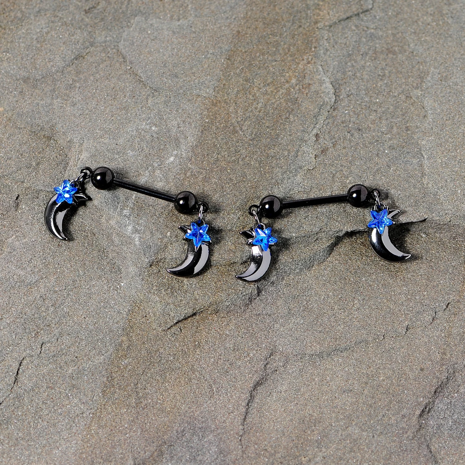 14 Gauge 9/16 Blue Gem Star Moon Dangle Nipple Ring Set