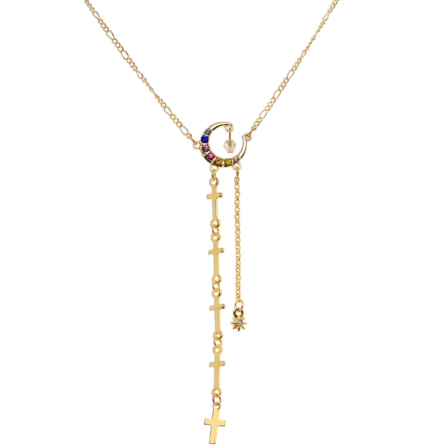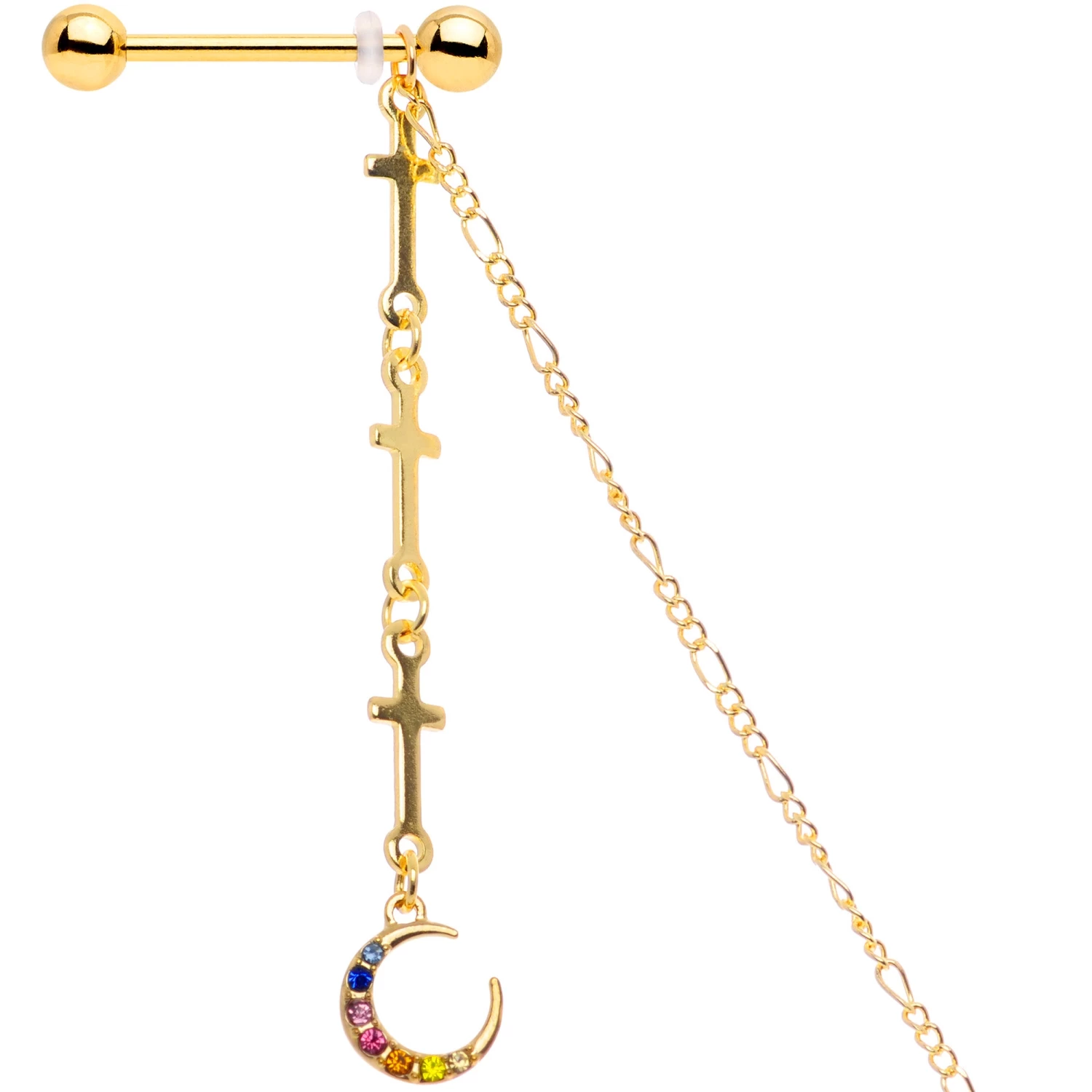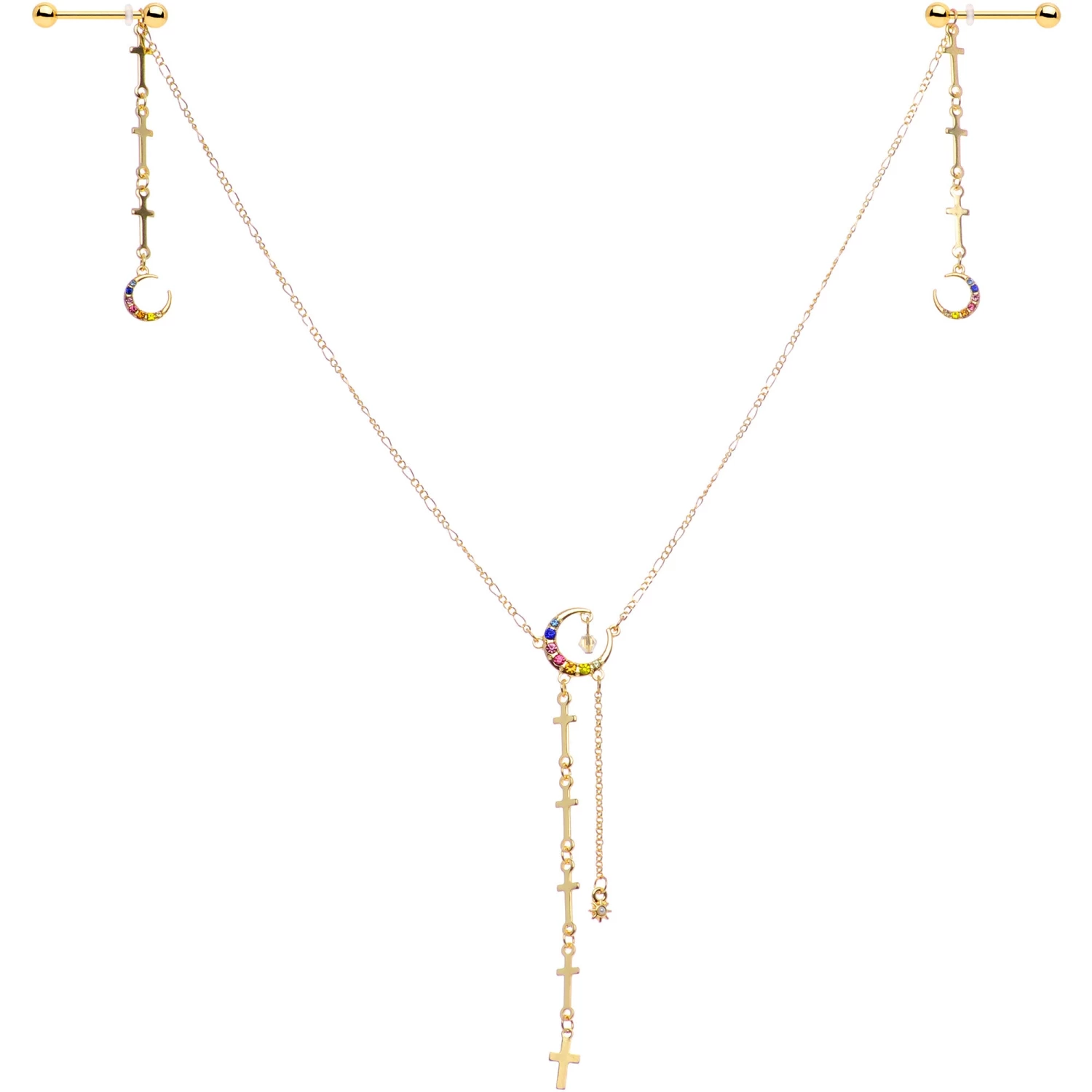 Show off your spiritual side with this cross-themed 14 gauge nipple jewelry! It’s made with 14mm gold tone PVD over 316L surgical grade stainless steel straight barbells with 5mm ball ends. Dangling between the two barbells is a 10 1/2″ length of gold tone chain that has a rainbow gem crescent moon charm at its center with a faceted clear gem dangling from its topmost point. Hanging from the bottom of the moon are two more chains, one composed entirely of linked crosses and the other simply tipped with a tiny star charm with a white pearlescent orb. To finish the look, the ends of the chain are each composed of three crosses and finished with another crescent moon with rainbow gems set in them. This beautiful nipple jewelry is sure to lift your spirit!