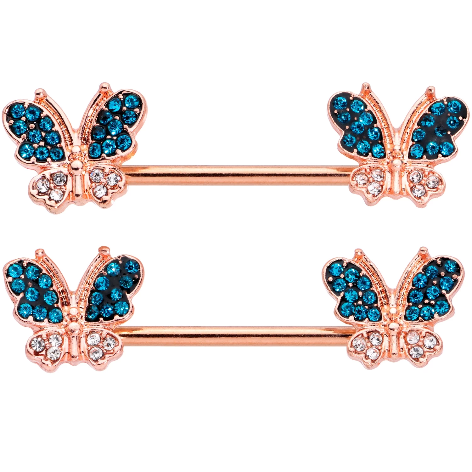 14 Gauge 9/16 Clear Aqua Gem Rose Gold Tone Butterfly Nipple Ring Set