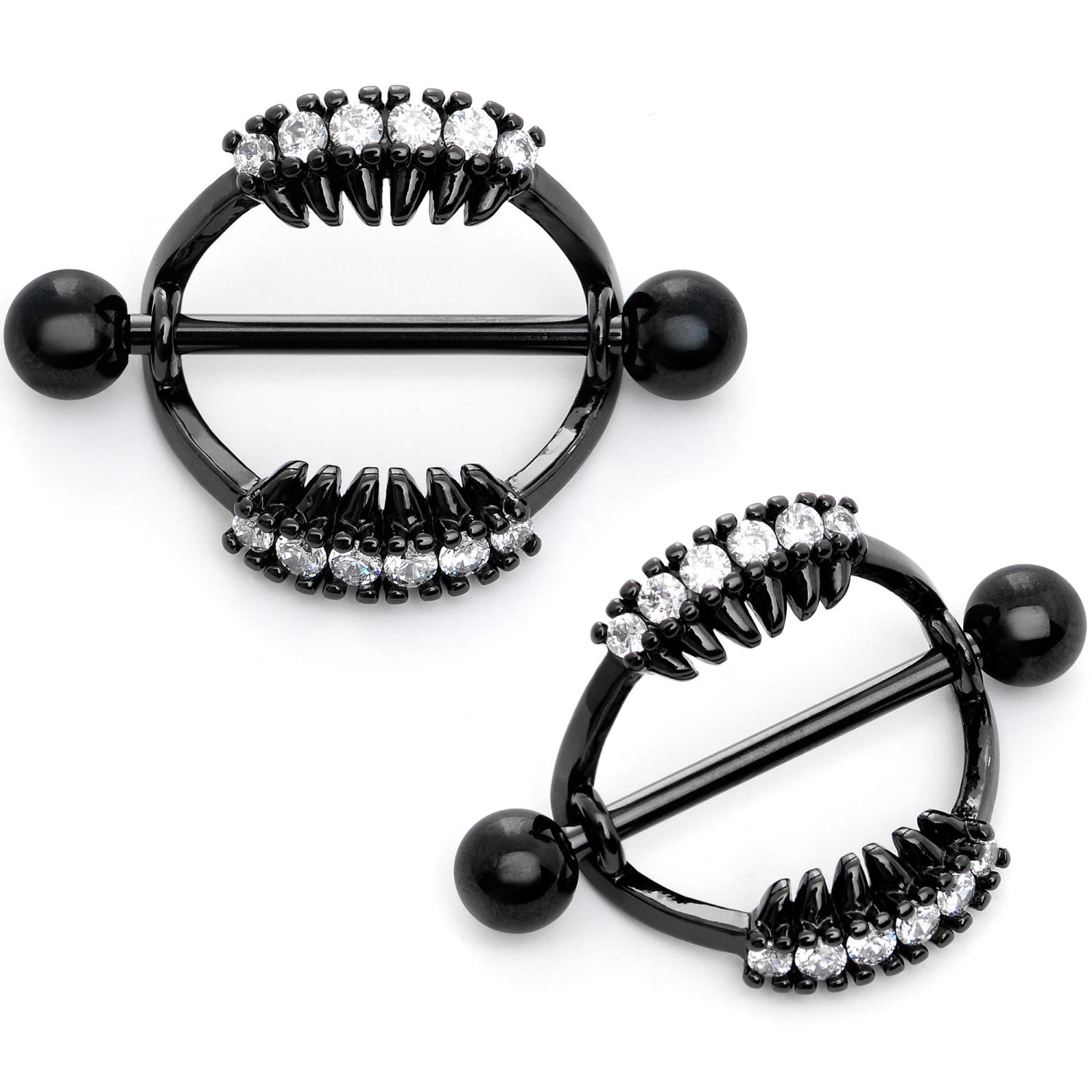 Those piercings must be yummy, even your body jewelry wants to take a bite! These 14 gauge nipple piercings are made with 14mm black PVD over 316L surgical grade stainless steel straight barbells with 5mm ball ends. They feature shield charms that resemble a monster’s open mouth, with scary teeth like fangs. They’re set with a row of clear cubic zirconia gems along the outside of the gums. Take a bite out of boring body jewelry by letting this nipple jewelry take a bite out of you! Sold as a set of two.