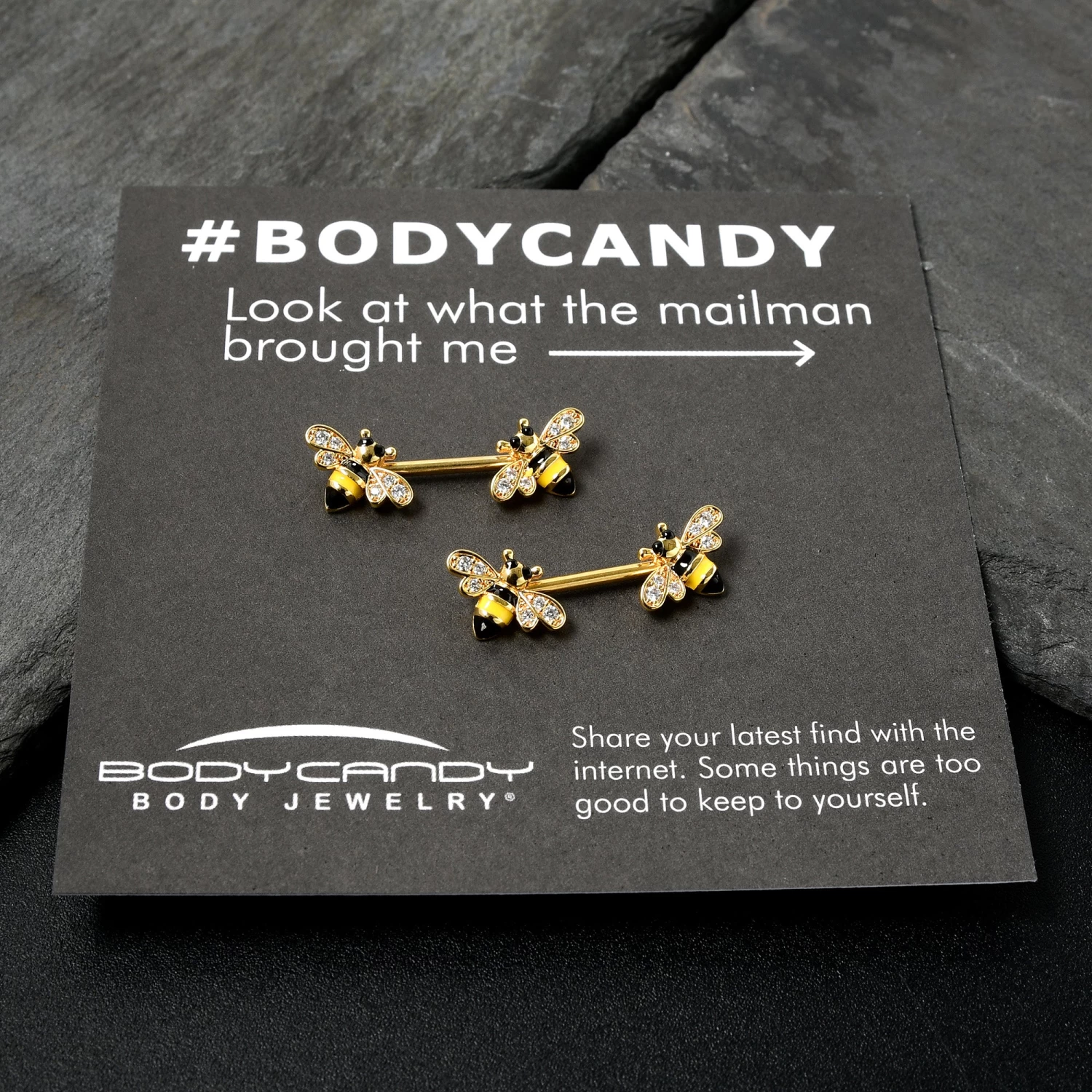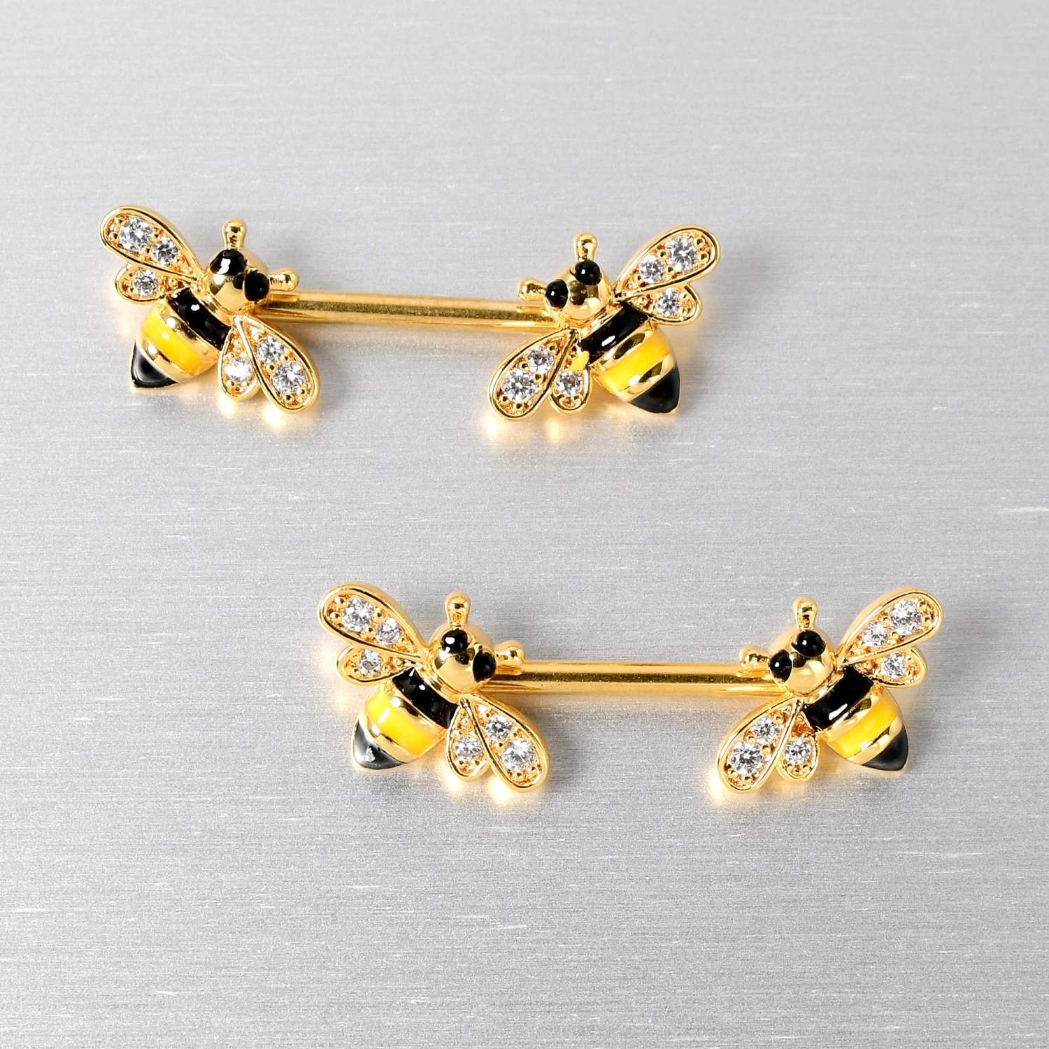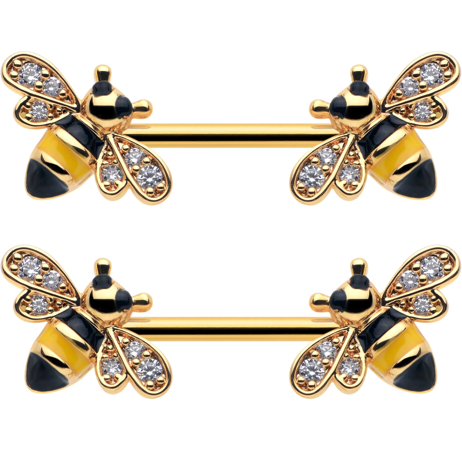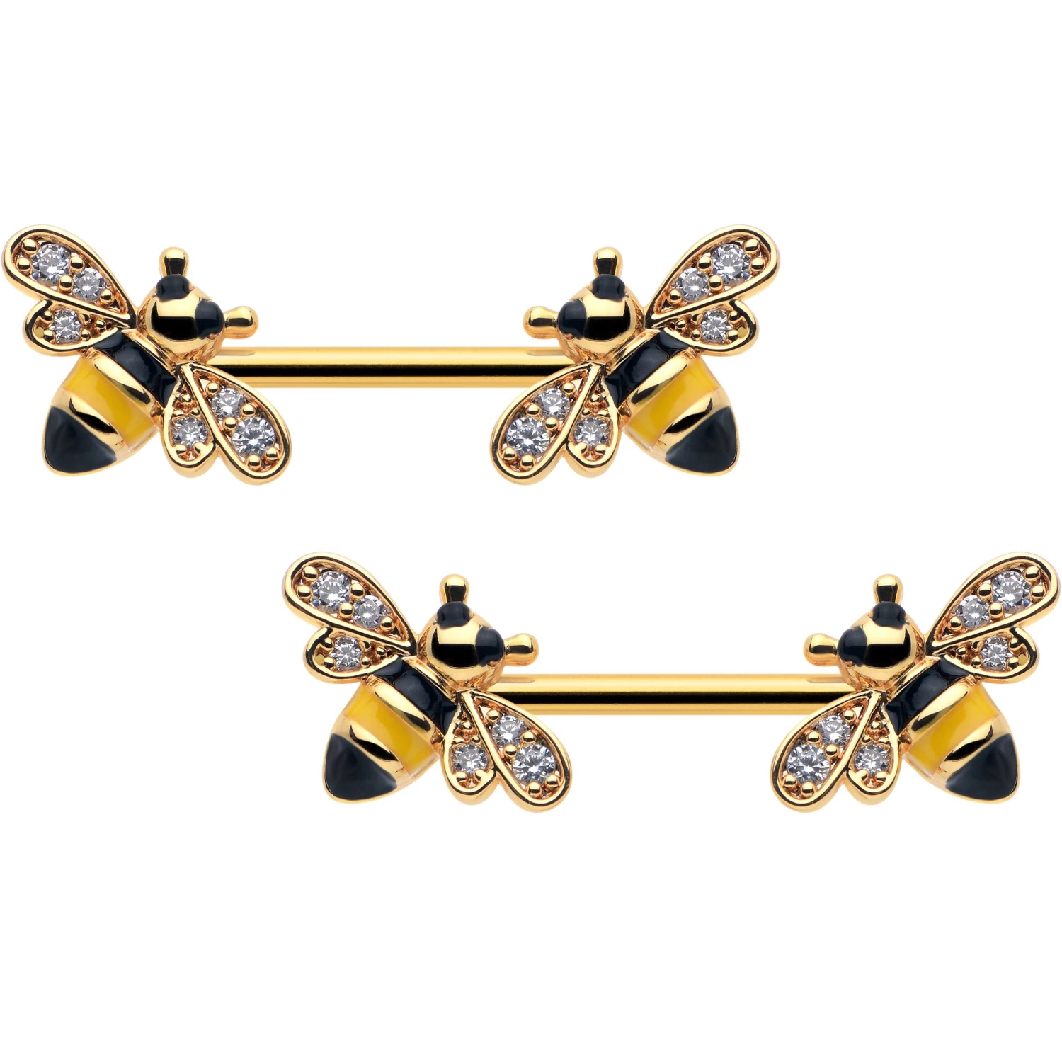 14 Gauge 9/16 Clear CZ Gem Gold Hue Honey Bees Barbell Nipple Ring Set