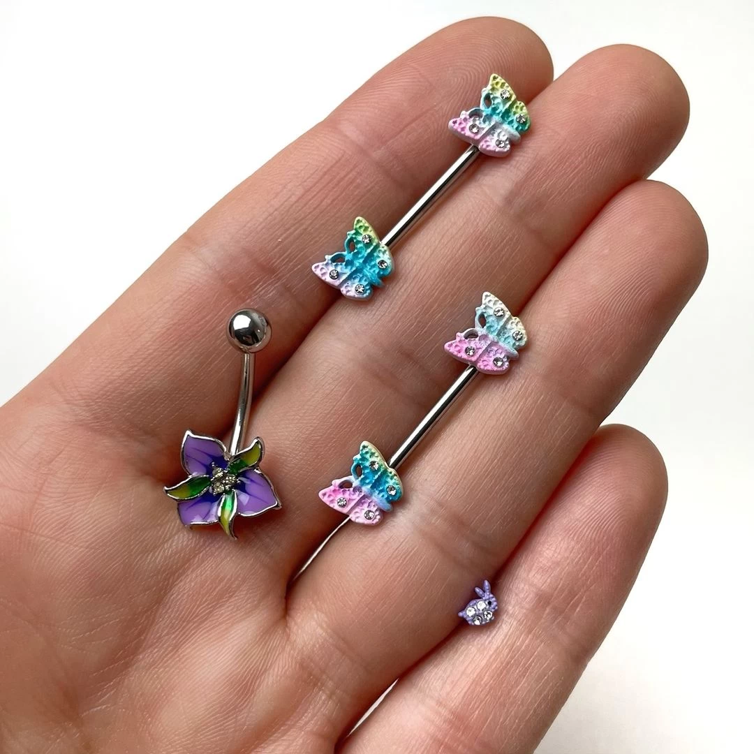Get big style in a small package with this 14 gauge nipple jewelry! It’s made with 14mm durable 316L surgical grade stainless steel straight barbells. Each of the ends features a butterfly charm. The butterflies are shades of purple, blue, and yellow and set with small clear gems for an added touch of glamour. Go big with these beautiful little butterfly nipple piercing rings! Sold as a set of two.