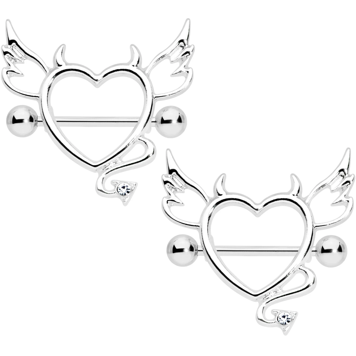 Even the most angelic heart can have a devilish side this Valentine’s Day with these 14 gauge nipple shields! They’re made with 14mm durable 316L surgical grade stainless steel straight barbells with 5mm ball ends. The shield portion features a hollow heart with detailed openwork wings. They also feature tiny horns and a short devilish tail that has a clear gem set into the triangular end. Whether your heart is naughty, nice, or both, you can express all three with this wickedly wonderful nipple jewelry! Sold as a set of two.