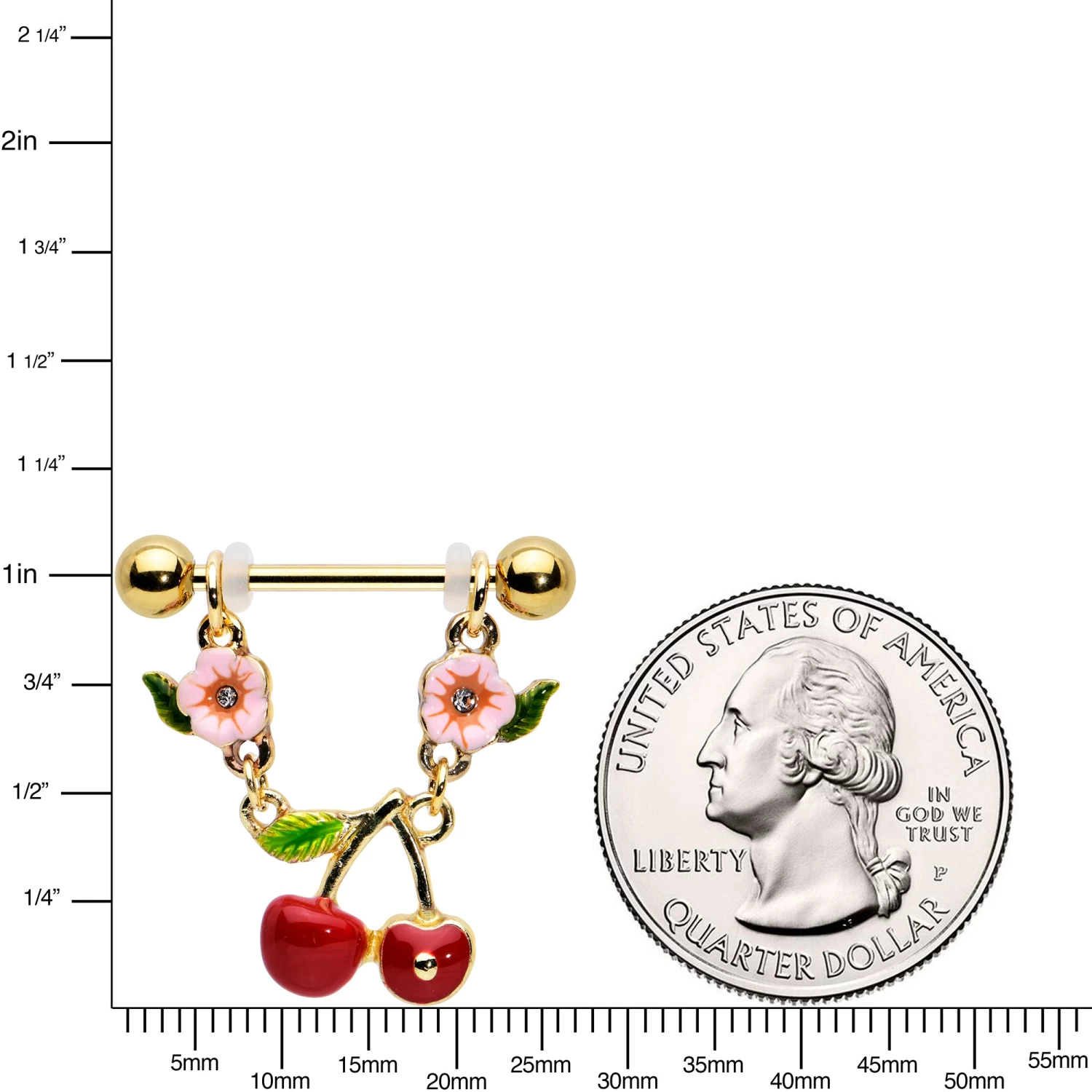 14 Gauge 9/16 Clear Gem Gold Tone Cherry Fruit Dangle Nipple Ring Set