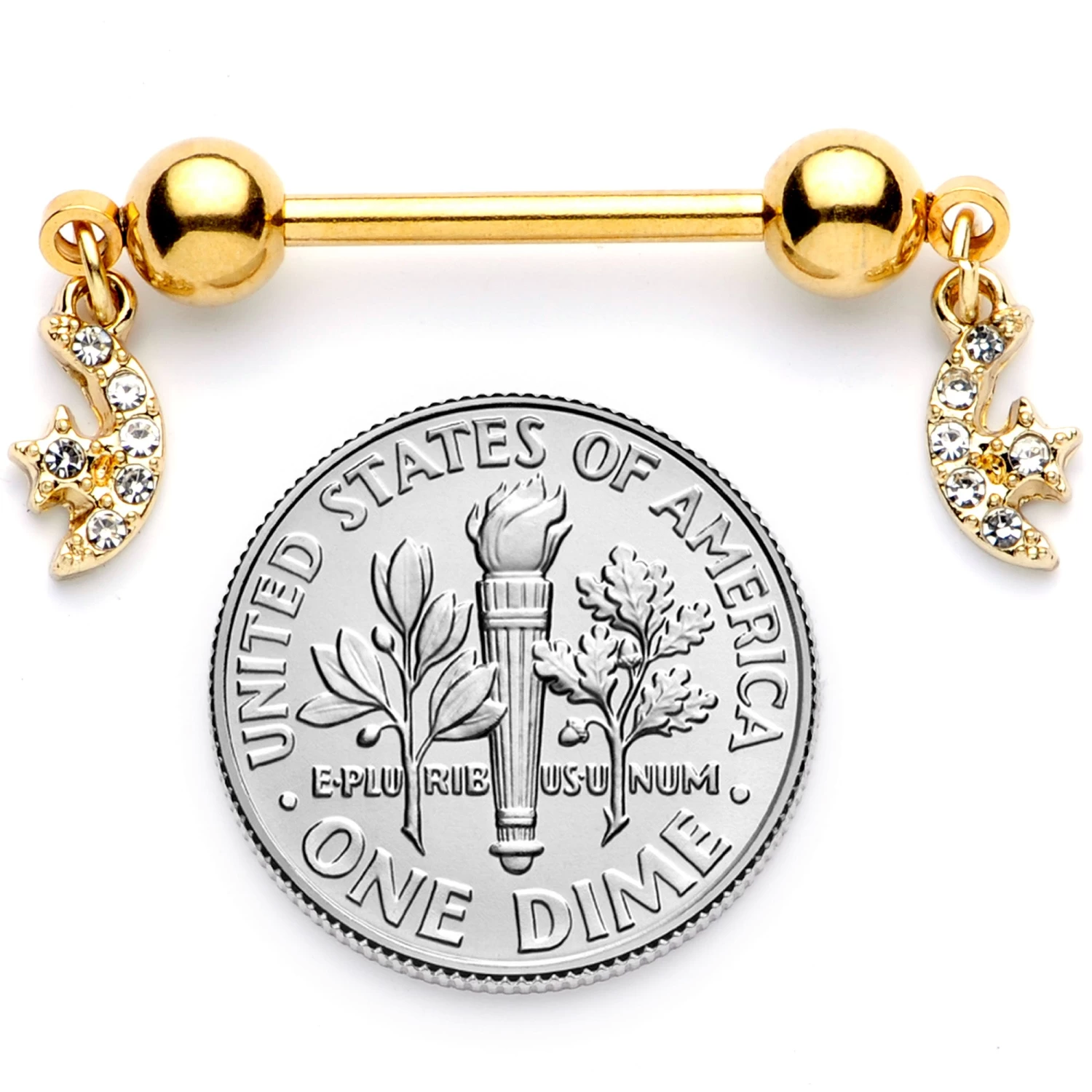 You may have the wind in your hair and stars in your eyes, but now you can have the moon in your nipple piercings with this 14 gauge nipple jewelry! It’s made with 14mm gold tone PVD over 316L surgical grade stainless steel straight barbells with 5mm ball ends. Dangling from the ball ends are crescent moon charms with stars held in its curve, both of which are paved in clear gems. This nipple jewelry has an understated appearance but will still be the star of the show. Let these marvelous moons take your nipple piercings to stardom! Sold as a set of two.