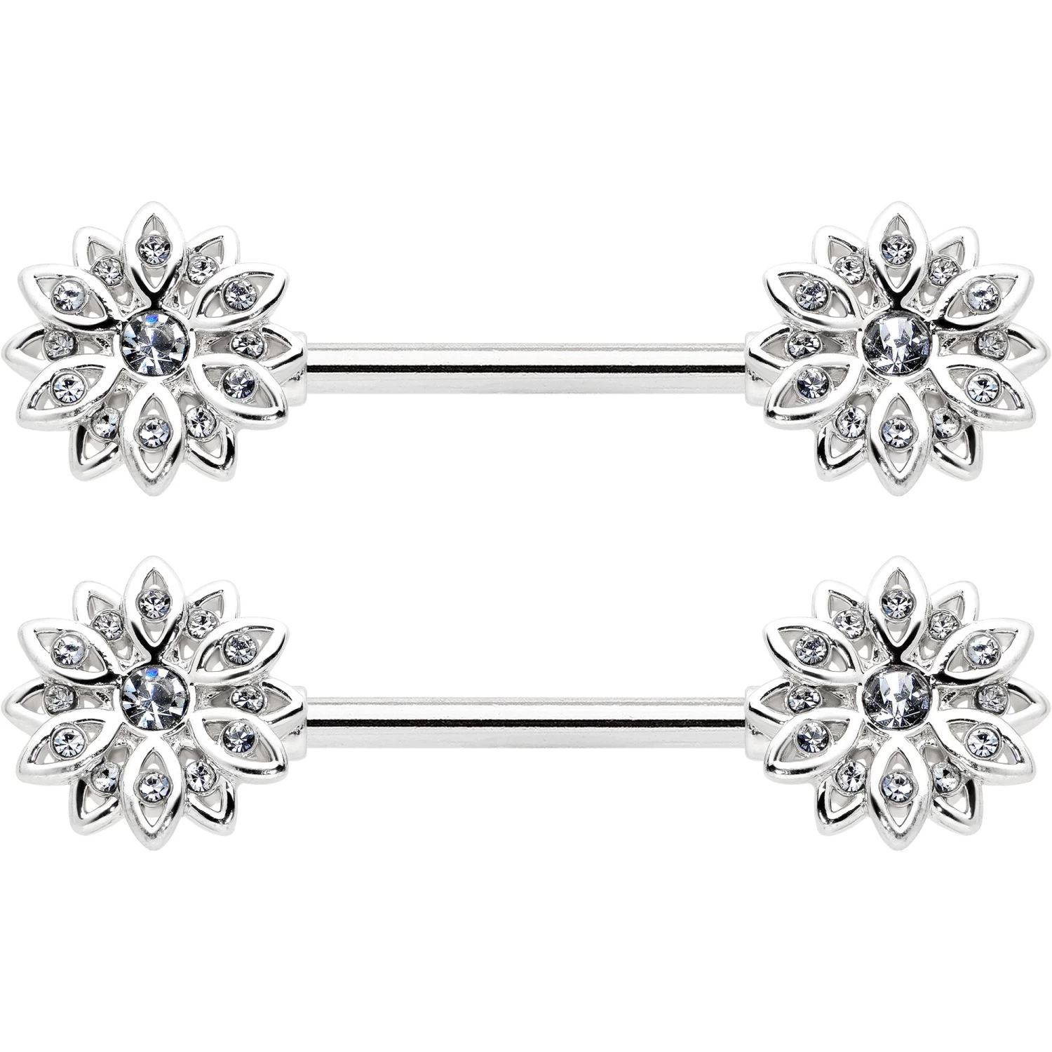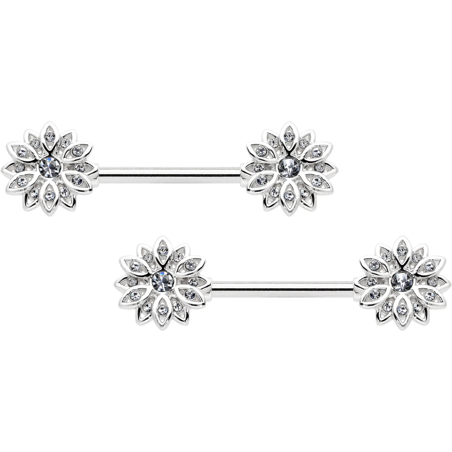 14 Gauge 9/16 Clear Gem Rococo Starry Flower Barbell Nipple Ring Set