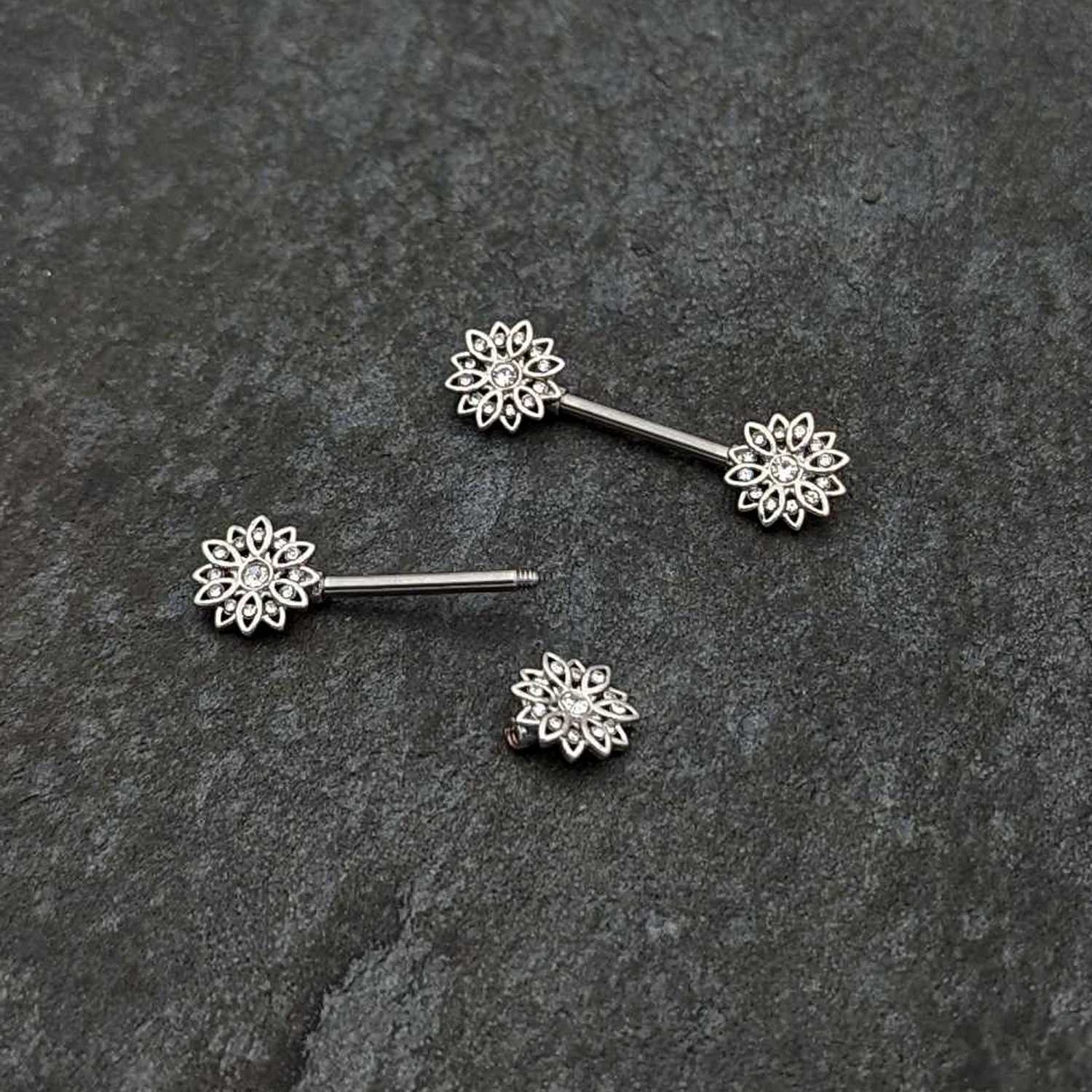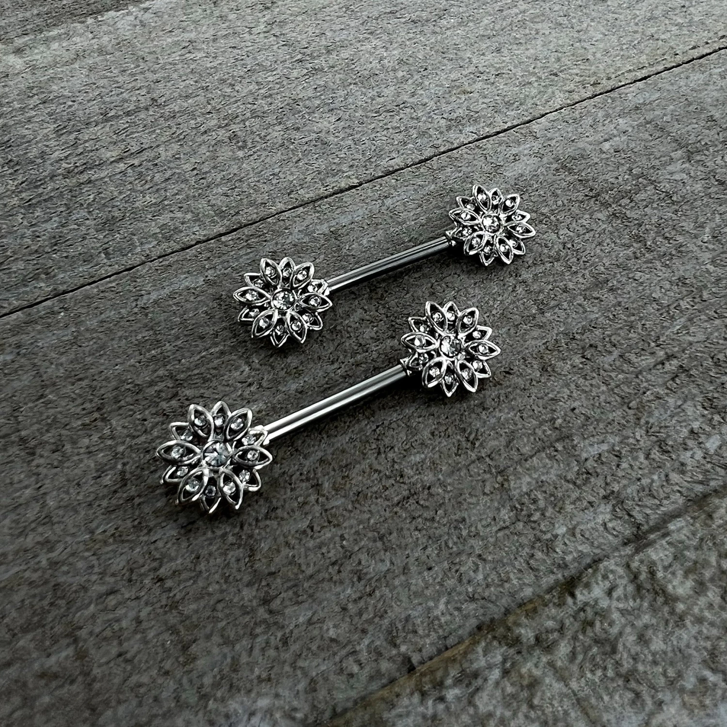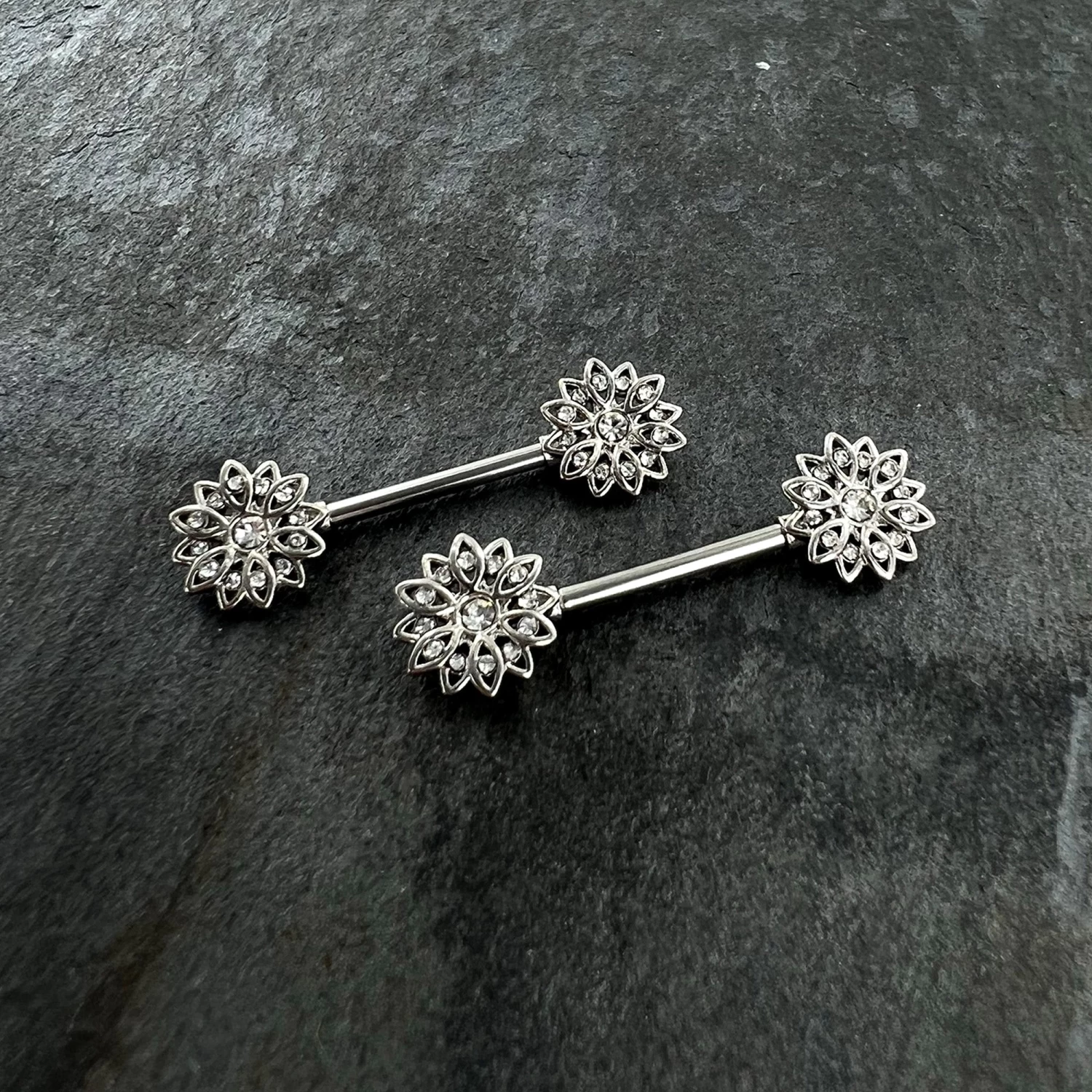 Some flowers are meant to be stars like this 14 gauge nipple jewelry! It’s made with 14mm durable 316L surgical grade stainless steel straight barbells. Each of the ennds features a detailed flower charm, with petals paved with clear gems and the flower is set at the center with another clear gem for a stunning rococo style. Let your piercings bloom at night when you’re rocking these striking starry flower nipple piercing rings. Sold as a set of two.