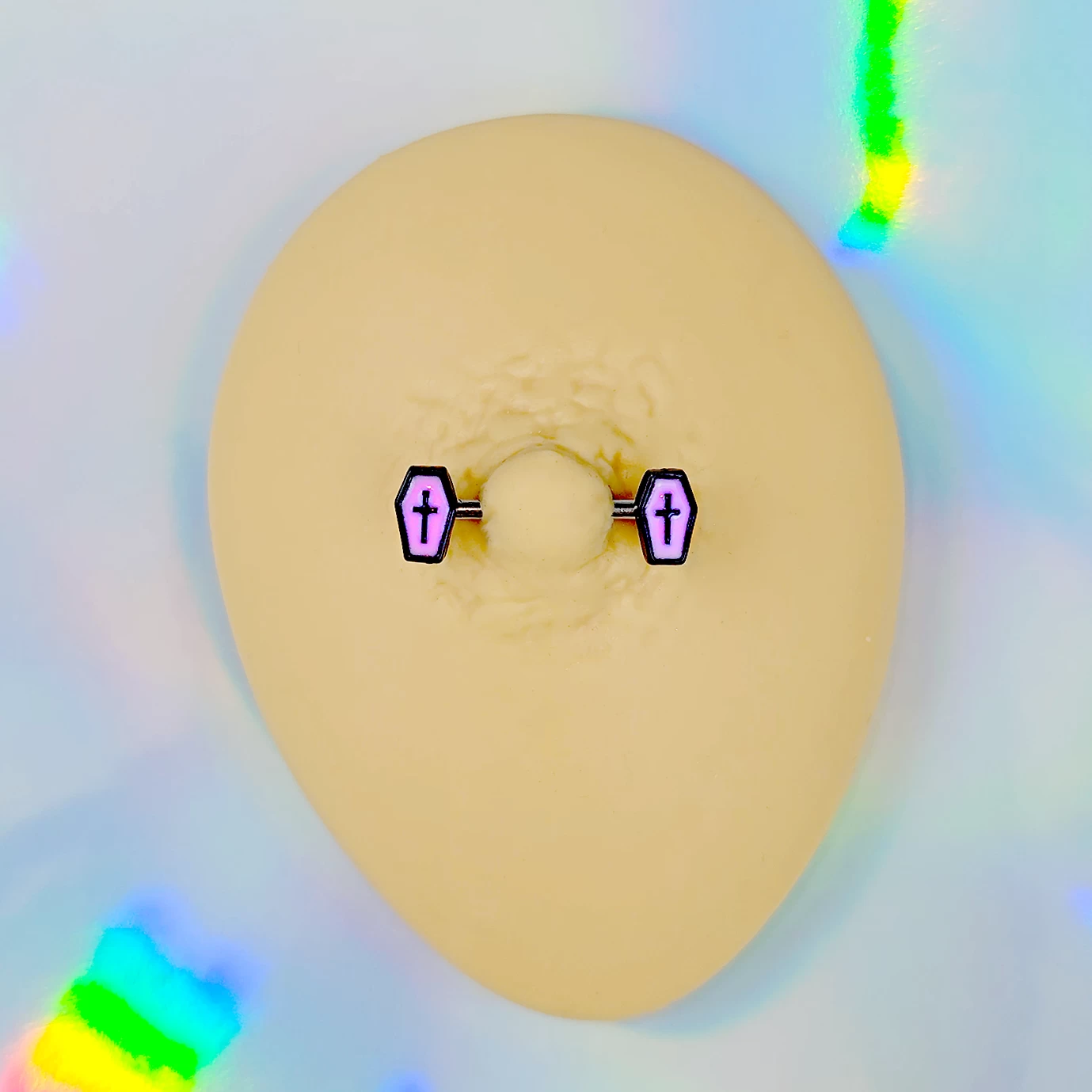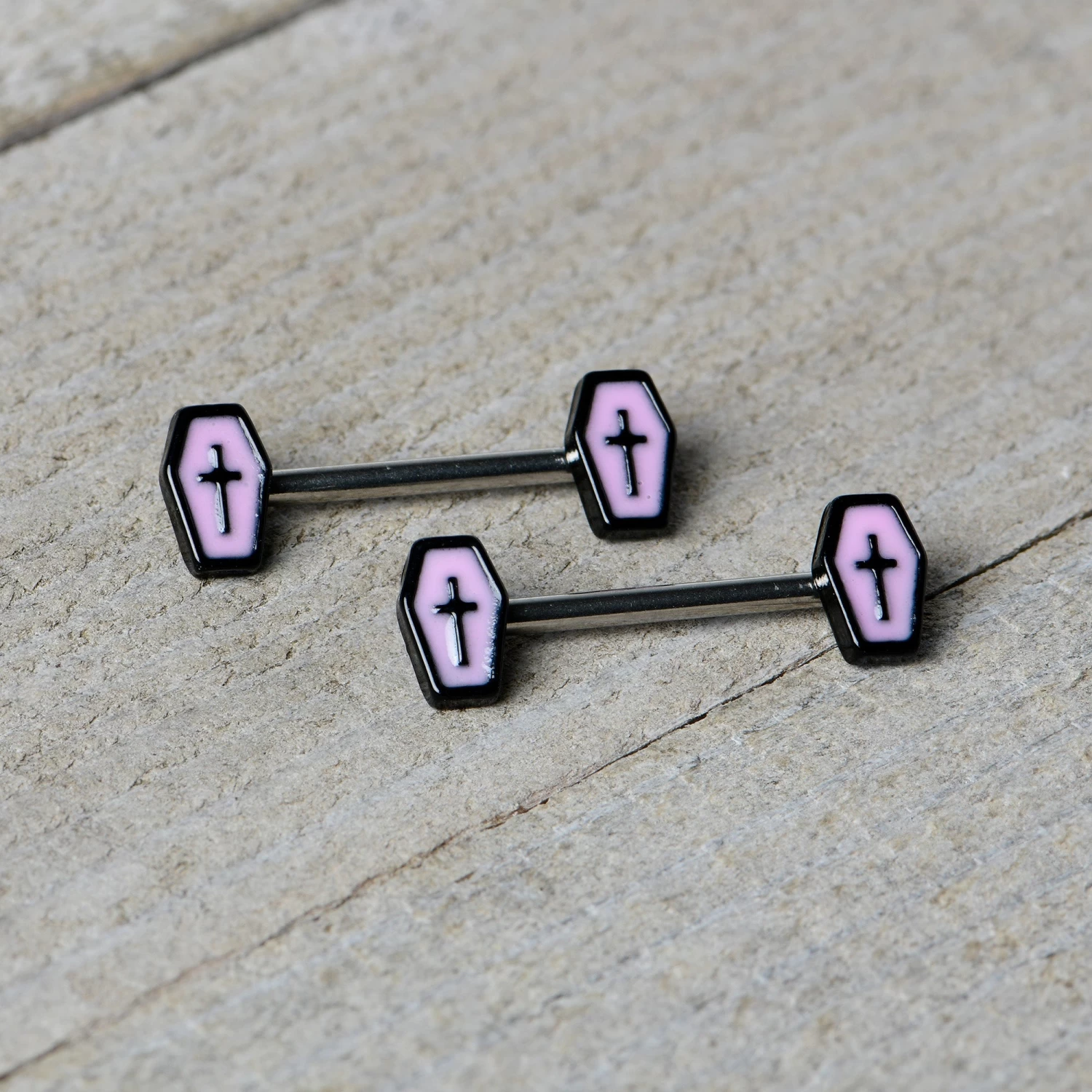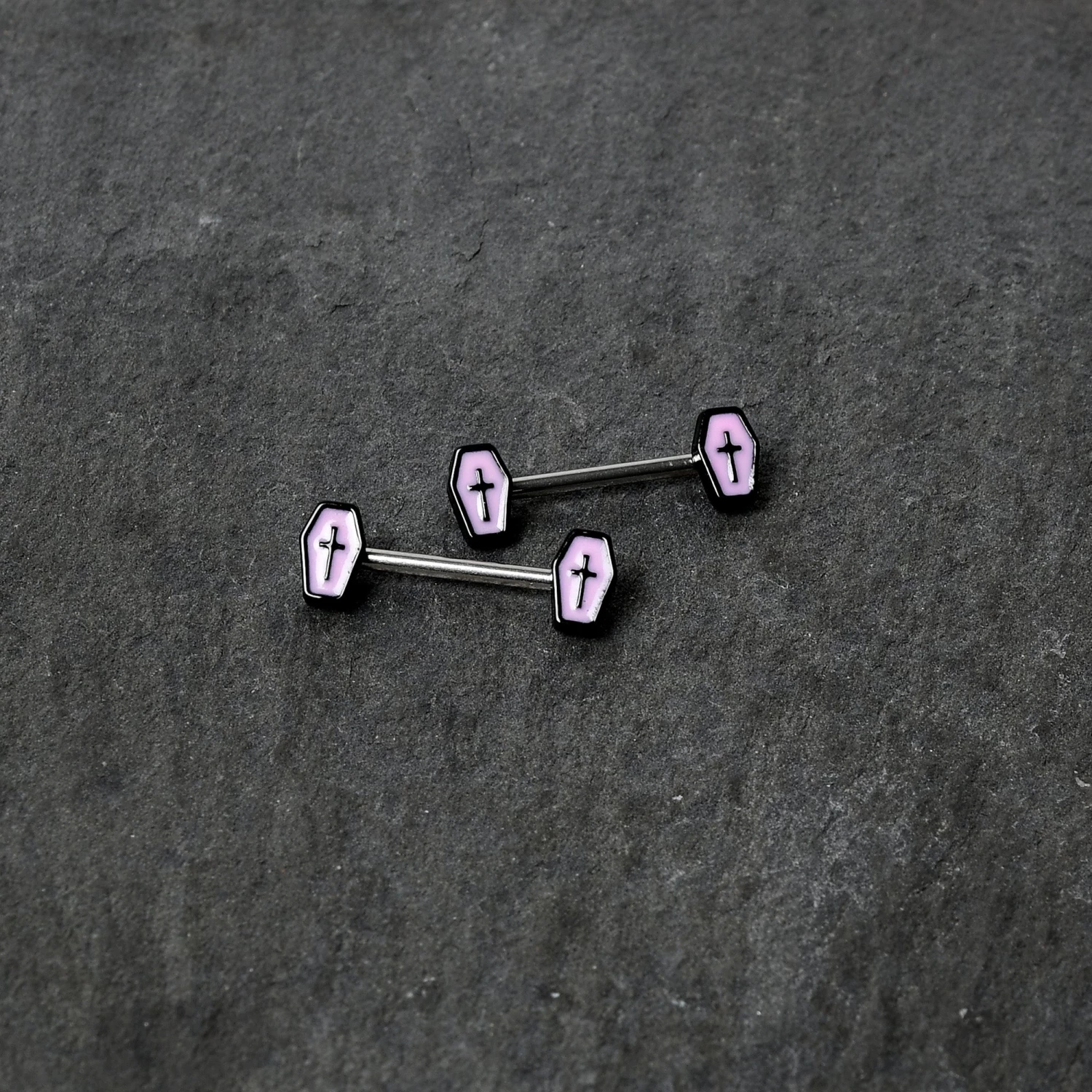 Bring your nipple piercings back from the dead this Halloween with this 14 gauge nipple jewelry! It’s made with 14mm durable 316L surgical grade stainless steel straight barbells. Each of the ends features a light purple casket charm, with black detailing and cross embellishments. The coffins glow when the lights go out for a creepy cute look you’ll love! You’ll be glowing with joy when you’re rocking these spooky coffin nipple piercing rings! Sold as a set of two.