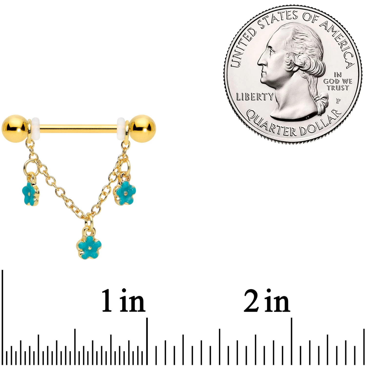 14 Gauge 9/16 Gold Tone Blue Flowers Chain Dangle Nipple Ring Set
