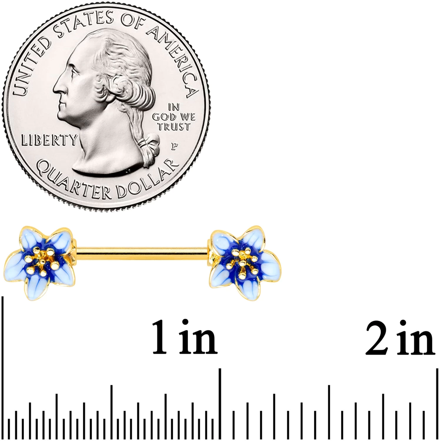 14 Gauge 9/16 Gold Tone White Blue Flower Barbell Nipple Ring Set