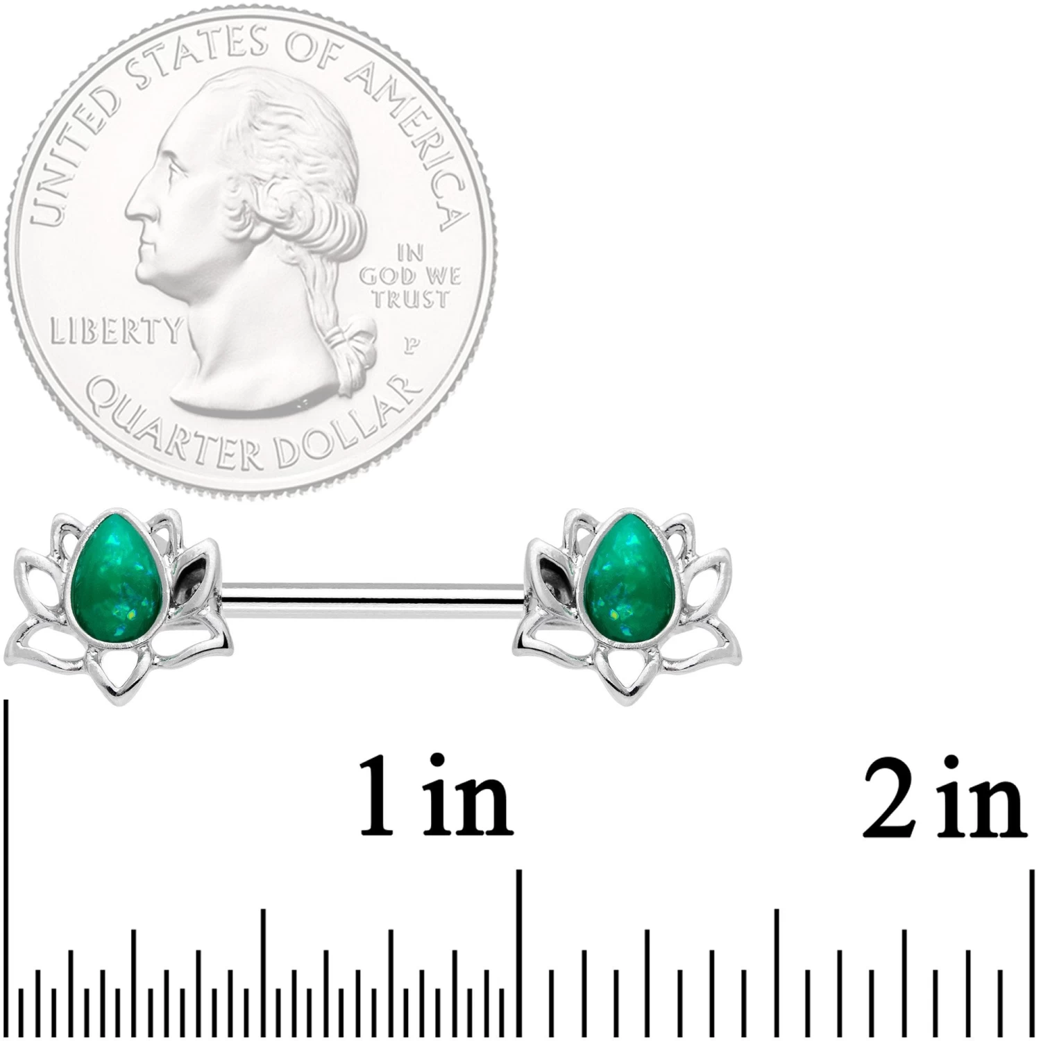 14 Gauge 9/16″ Green Faux Opal Lotus Flower Barbell Nipple Ring Set