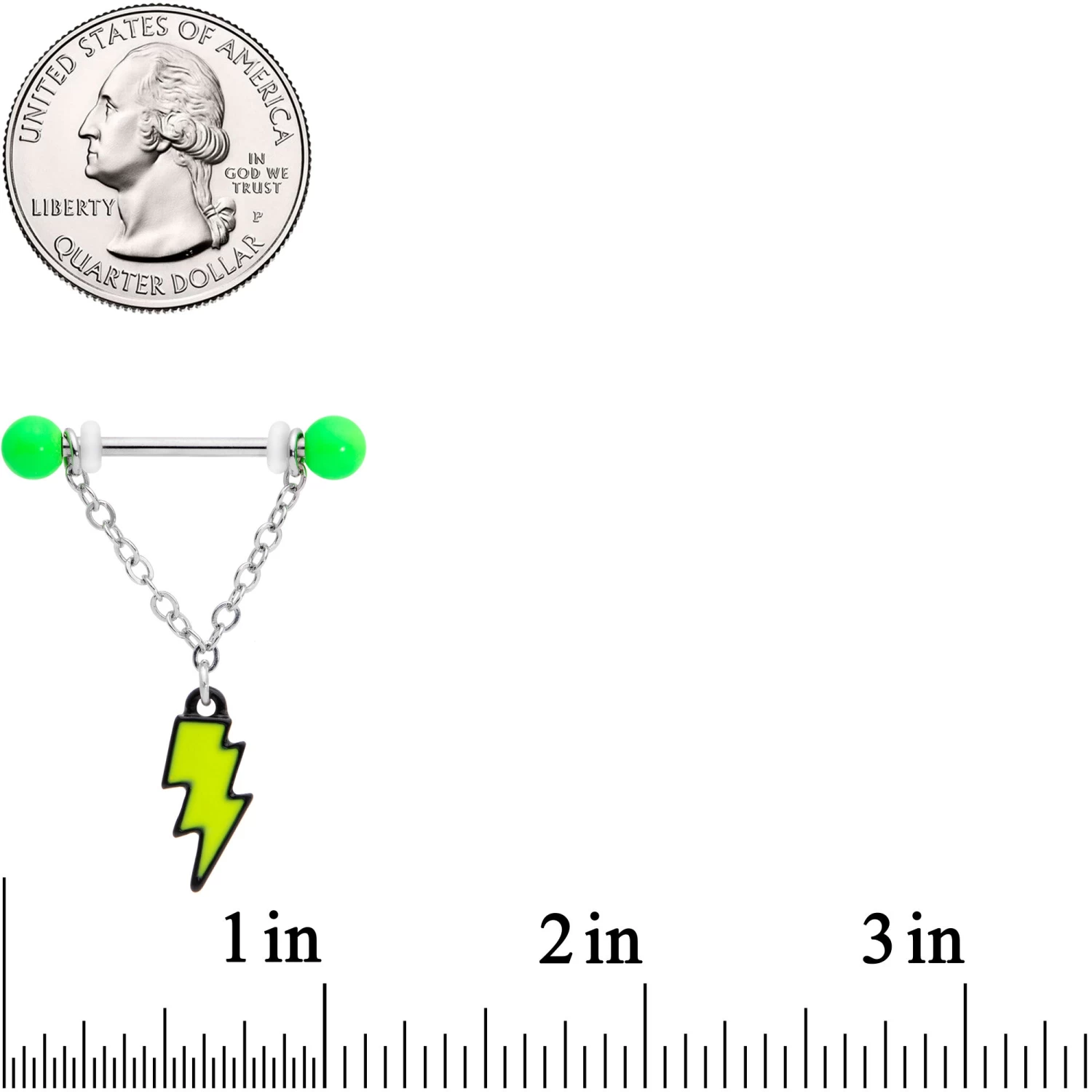 The odds of lightning striking the same place twice are pretty low…but so are the odds of seeing a UFO! These 14 gauge nipple barbells are made with 14mm durable 316L surgical grade stainless steel straight barbells and have 5mm neon green ball ends. Dangling from one is a chain that supports a yellow lightning bolt charm with black outlining. The other one has a blue and purple spaceship dangle charm! Whether you want to ride a lightning bolt or hang with some aliens, we’ve got you covered with this set of stellar outer space nipple jewelry! Sold as a set of two.