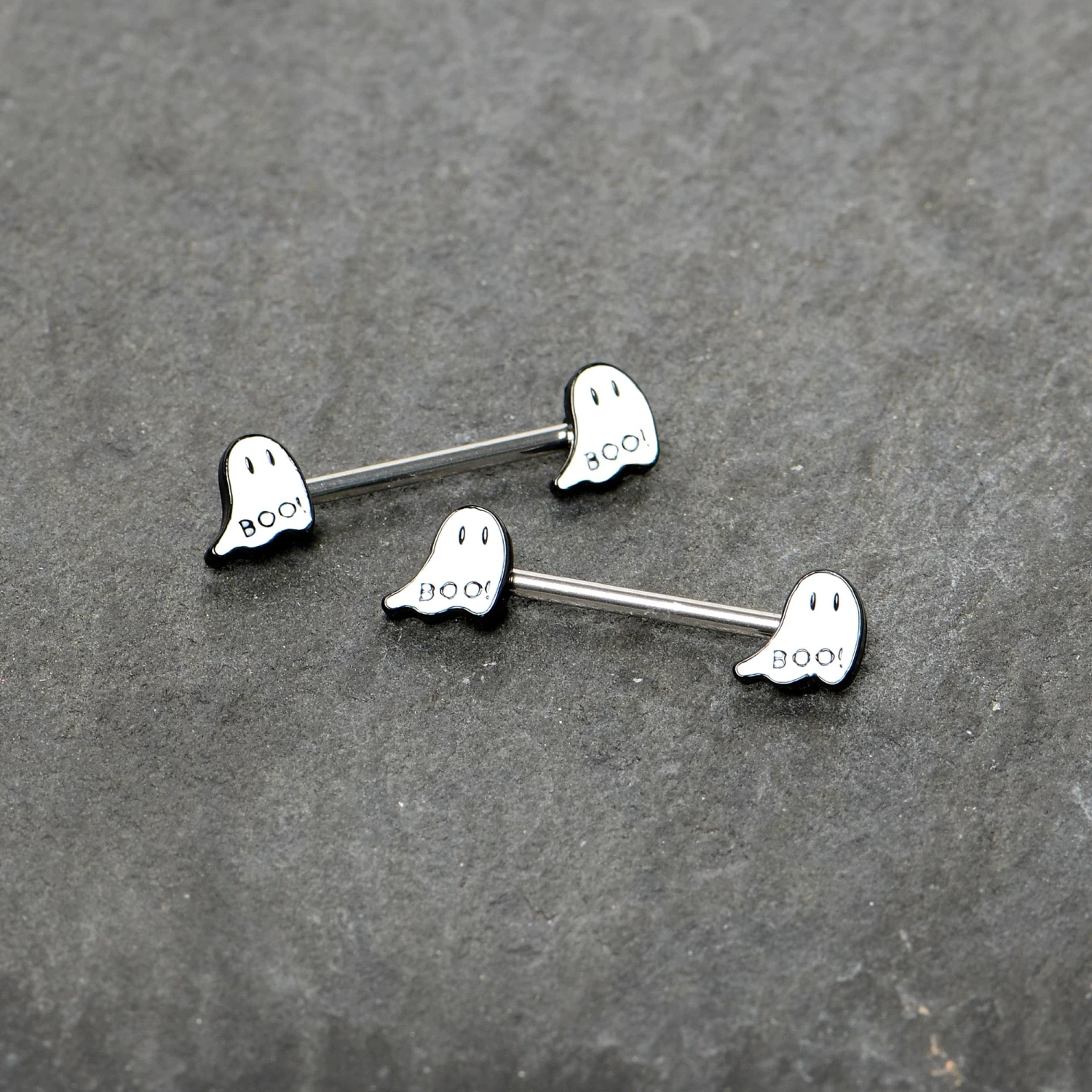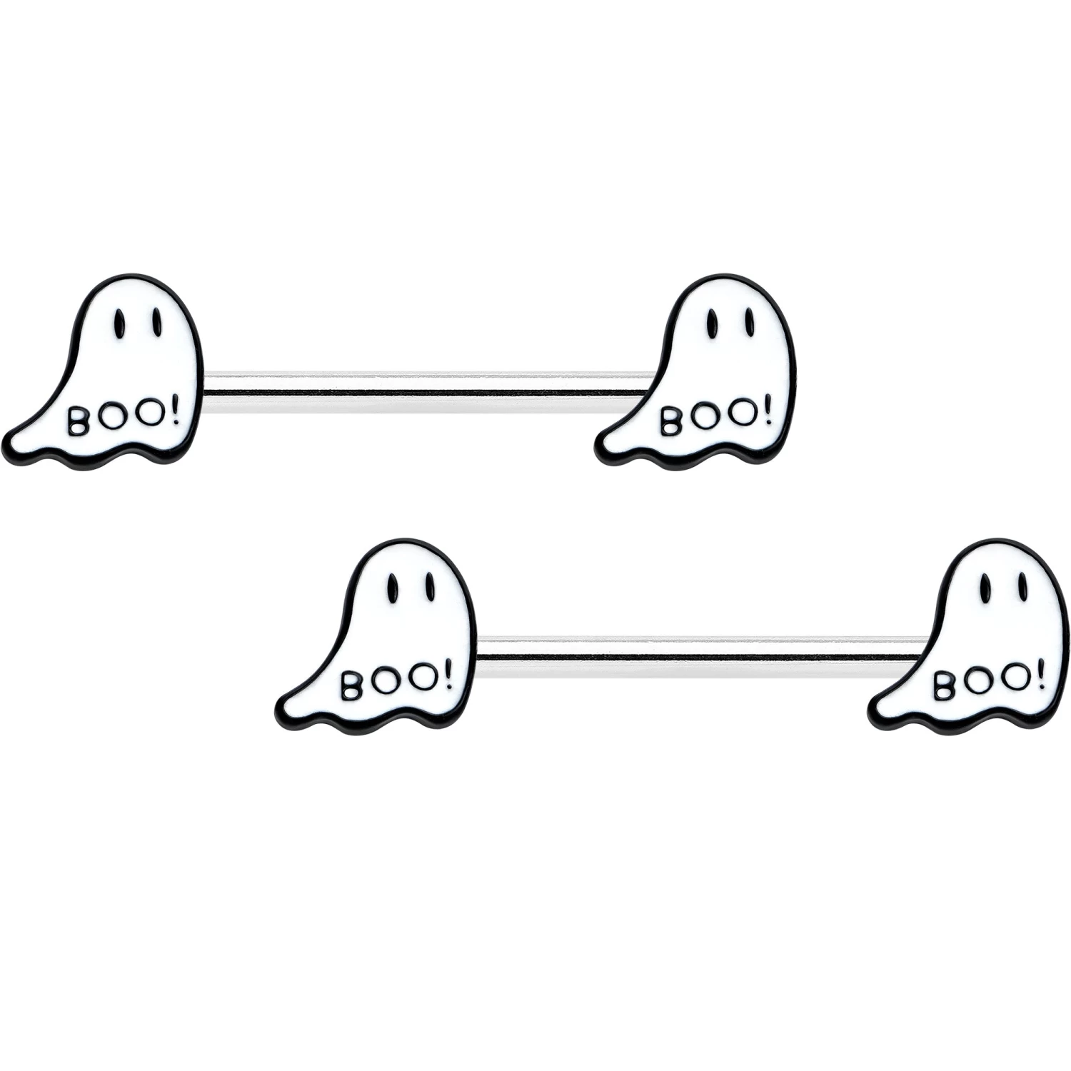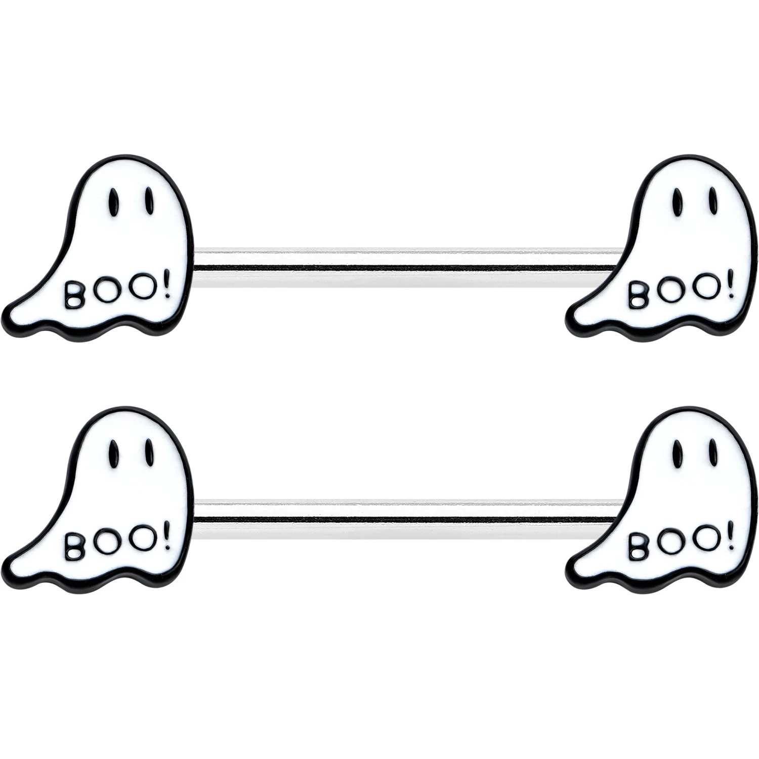 Get a look that’s as haunting in the dark as it is in the light with this 14 gauge nipple jewelry! It’s made with 14mm durable 316L surgical grade stainless steel straight barbells. Each of the ends features a white ghost charm, with black eyes and the word “boo!” on its bottom! The ghosts glow when the lights go out for a creepy cute look you’ll love! Your nipple piercings will have a whole new glow about them with these hauntingly charming Halloween nipple piercing rings. Sold as a set of two.