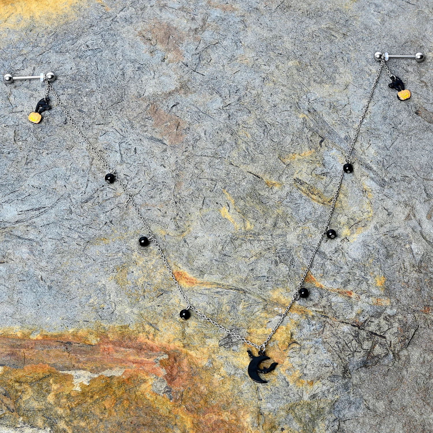 Don’t forget to decorate your nipple piercings for Halloween with this 14 gauge nipple jewelry! This set of nipple piercings are made with 14mm durable 316L surgical grade stainless steel straight barbells with 5mm ball ends and are connected by a 14-inch wearable length of chain. There are pumpkin and black cat charms that dangle by the barbells, while the entire length of chain is embellished with dangling black baubles. The center point of the chain supports a black silhouetted crescent moon charm, with a pair of flying bats around it for a look that screams Halloween! You’ll be all dressed up and ready to scream with this spooky, stylish Halloween nipple piercing jewelry!