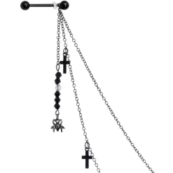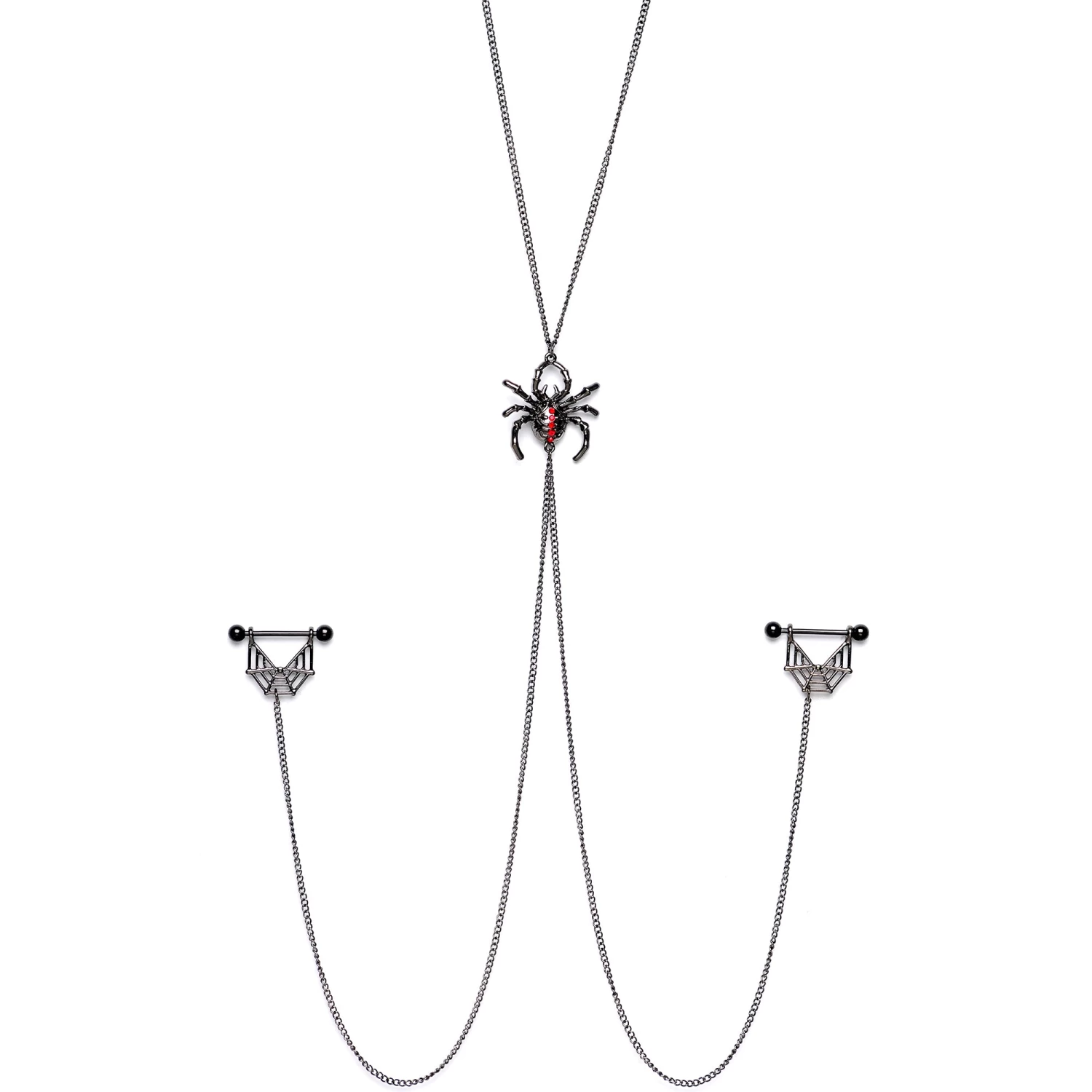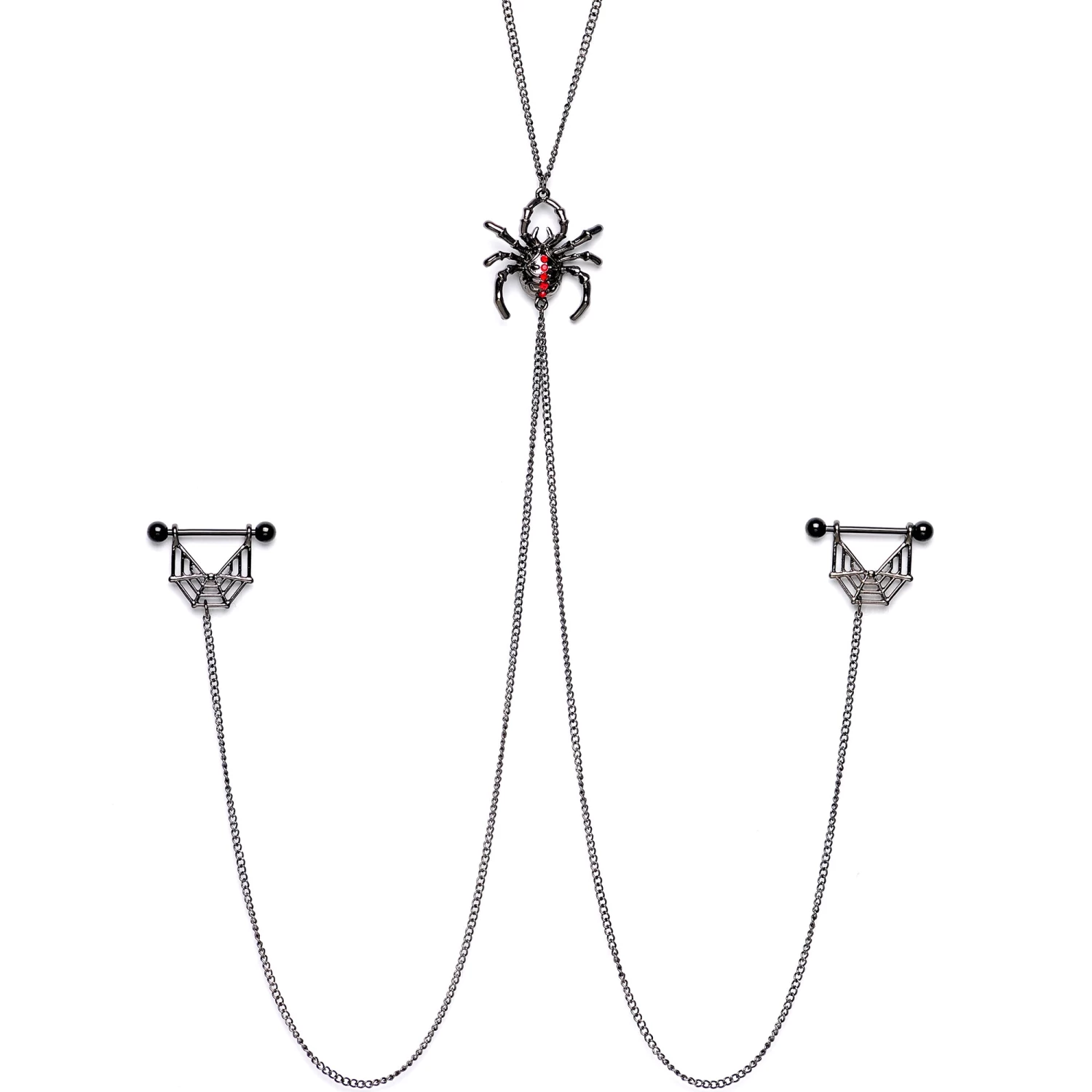 You’re going to love this necklace to nipple chain because it’s so creepy and perfect for Halloween! This necklace to nipple chain features a 28″ total length necklace that has a red gem spider charm at the center that has two lengths of matching chain dangling from it. The two chains are 12″ and connect to the 14mm black PVD over 316L surgical grade stainless steel straight barbells with 5mm ball ends. Dangling from the barbells are spider web charms. With this stunning necklace nipple chain, your piercings are sure to be the queen of Halloween!