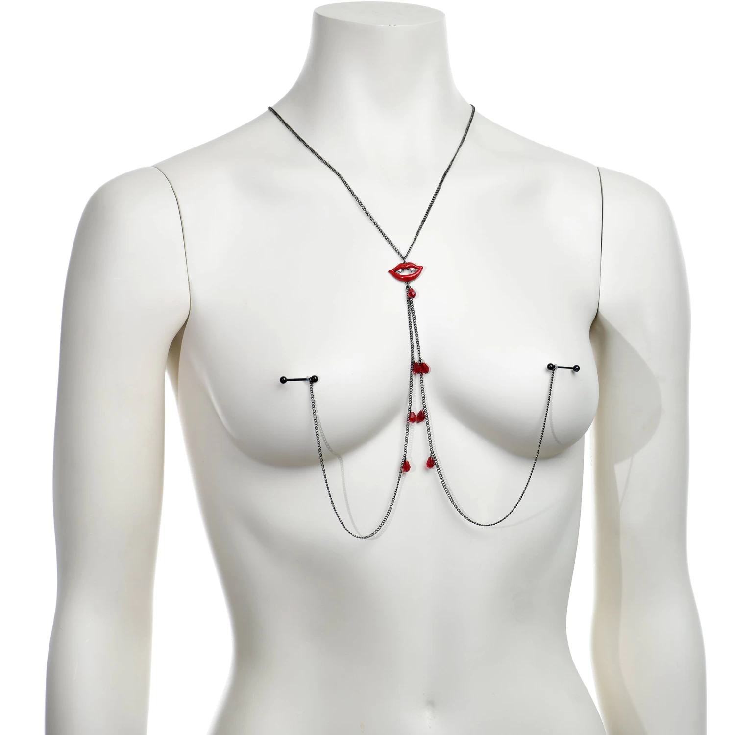 14 Gauge 9/16 Red Gem Vampire Lips Halloween Nipple Chain Necklace