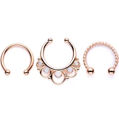 14 Gauge 9/16 White Faux Opal Rose Gold Tone Fancy Nipple Ring Set