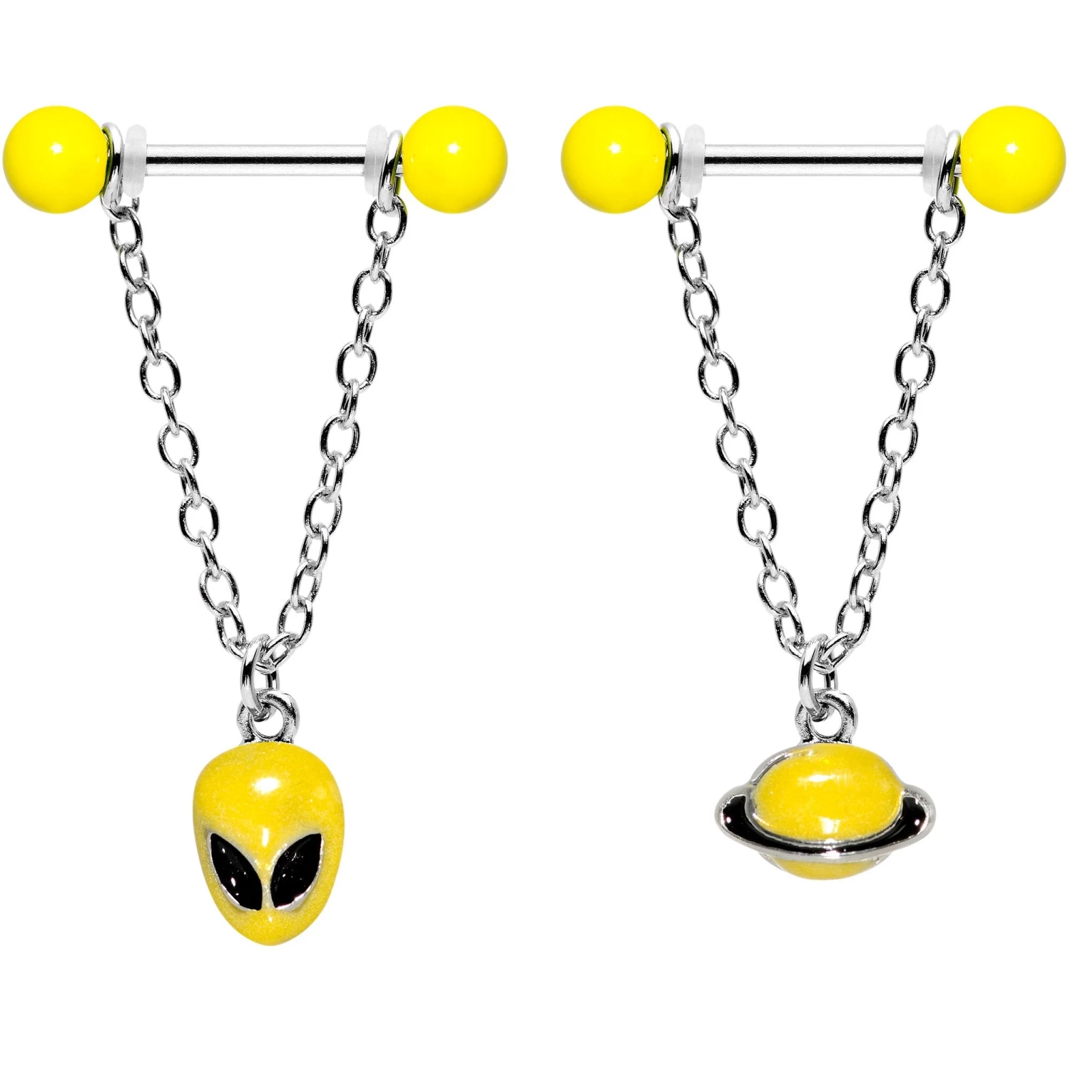 14 Gauge 9/16″ Yellow Glow Alien Saturn Dangle Barbell Nipple Ring Set