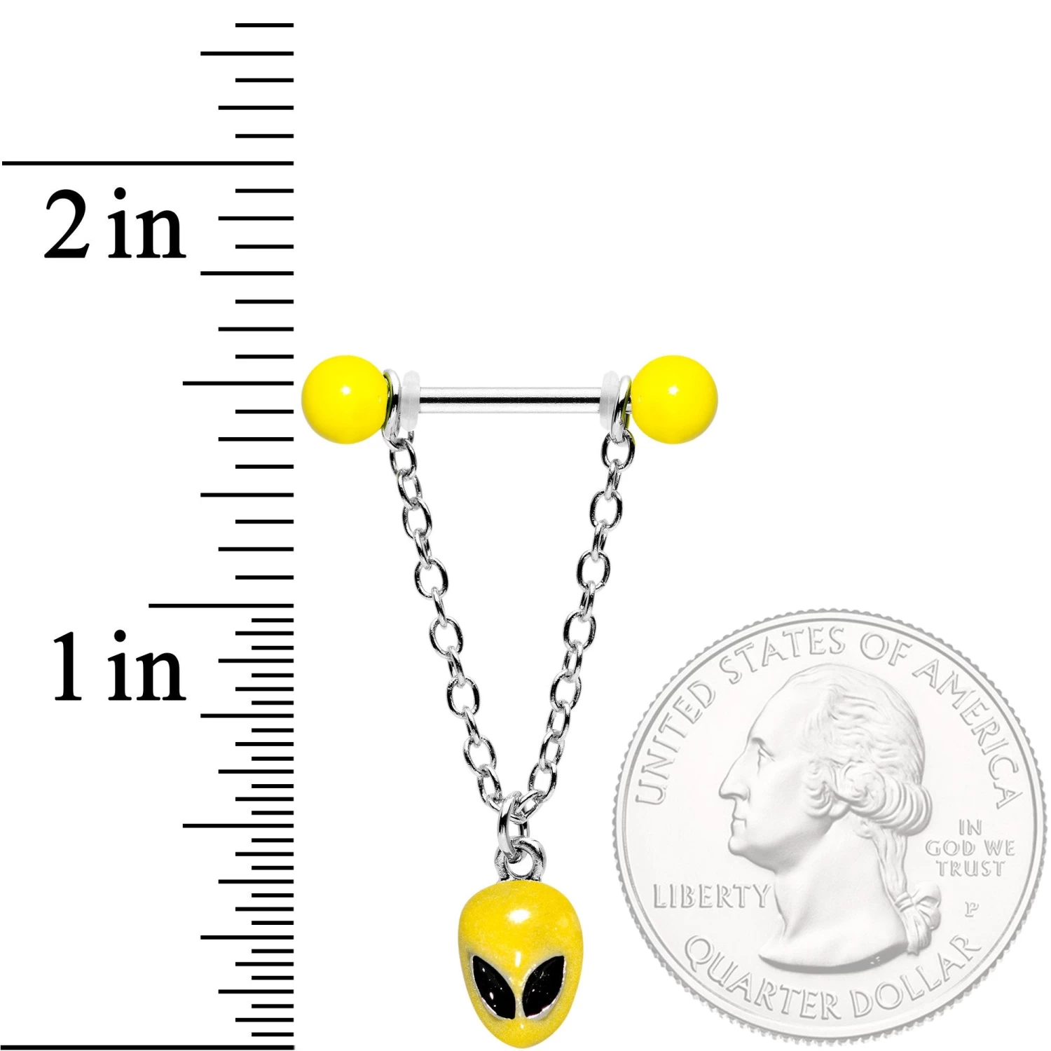 Perhaps this alien was worried about getting homesick because he’s brought his own planet along with him! These 14 gauge nipple piercings are made with 14mm durable 316L surgical grade stainless steel straight barbells with 5mm yellow ball ends. The barbells have adjustable chains dangling from them. One features the alien’s enigmatic yellow face with black color eyes. The other features the yellow planet Saturn, with its ring clearly defined so there’s no mistaking it. Best of all, turn off the lights and all the yellow embellishments glow in the dark! Even if the alien should happen to want to go home, at least he won’t have to travel in the dark! Sold as a set of two.