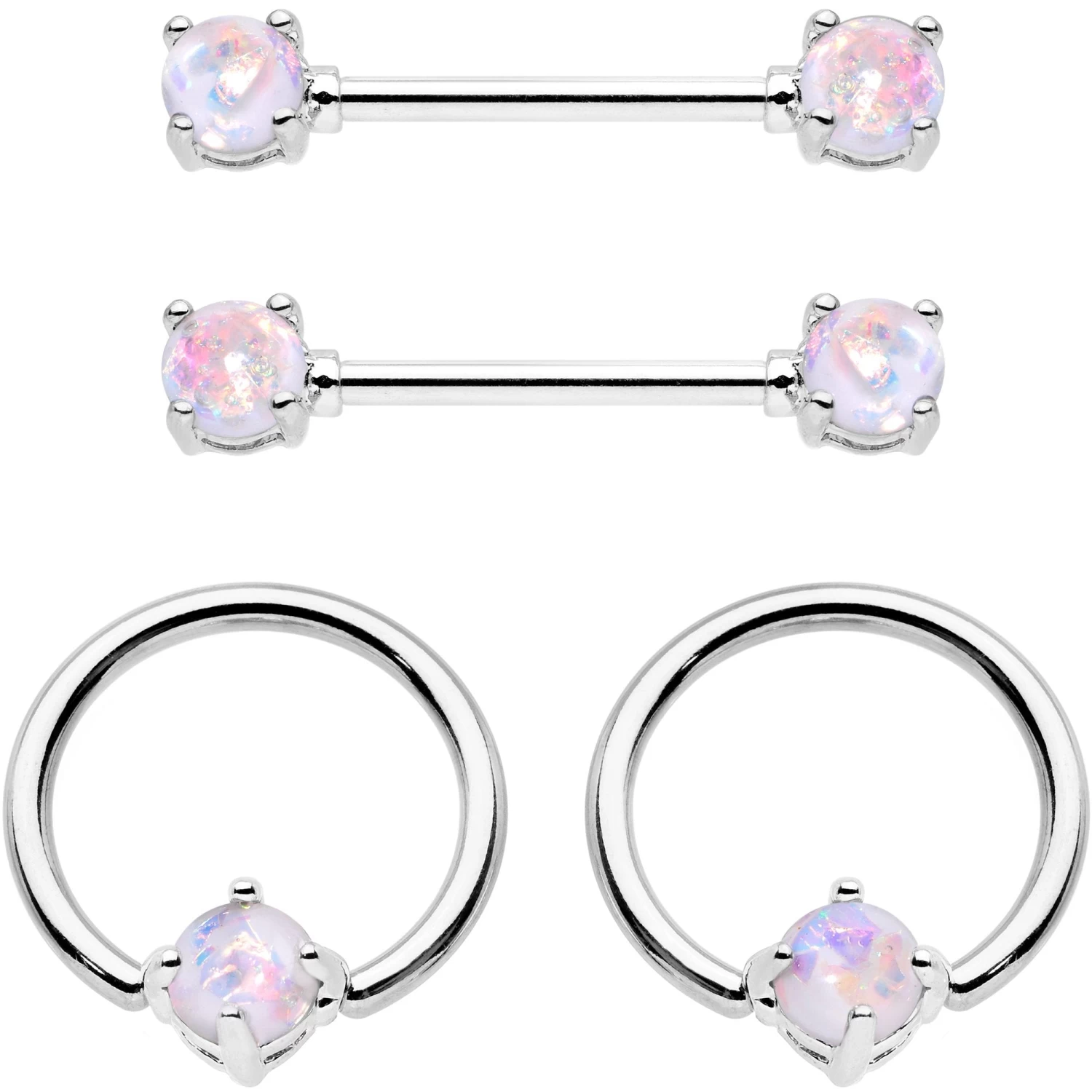 White Faux Opal Captive Ring Straight Barbell Nipple Ring Set