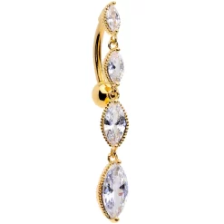 For understated style with a luxurious feel, check out this 14 gauge navel ring. It is 3/8 inch and made with solid 14kt yellow gold. It has a 4mm top ball end, which is set with a clear cubic zirconia gem. The bottom end features a single, large, red, rectangle shaped cubic zirconia gem for a truly opulent appearance. If you are looking for style without sacrificing quality, you cannot go wrong with this luxury belly piercing ring.