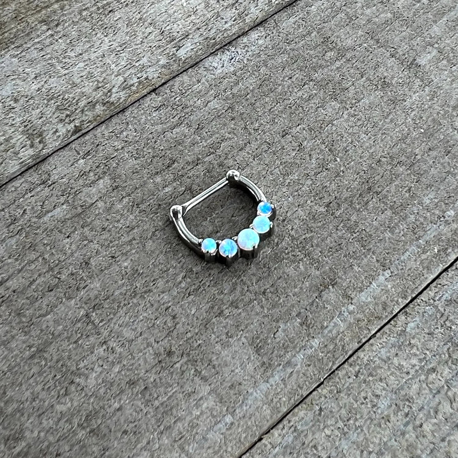 Show off your unique style when you wear this classically simple septum piercing. This septum ring is made with a hinged 6mm surgical grade stainless steel straight barbell and a series of white synthetic opals that will add simple, charming style to your septum jewelry collection.